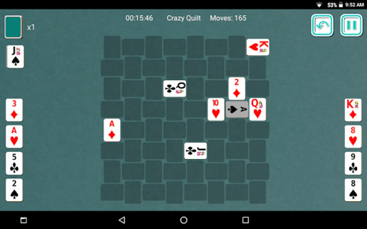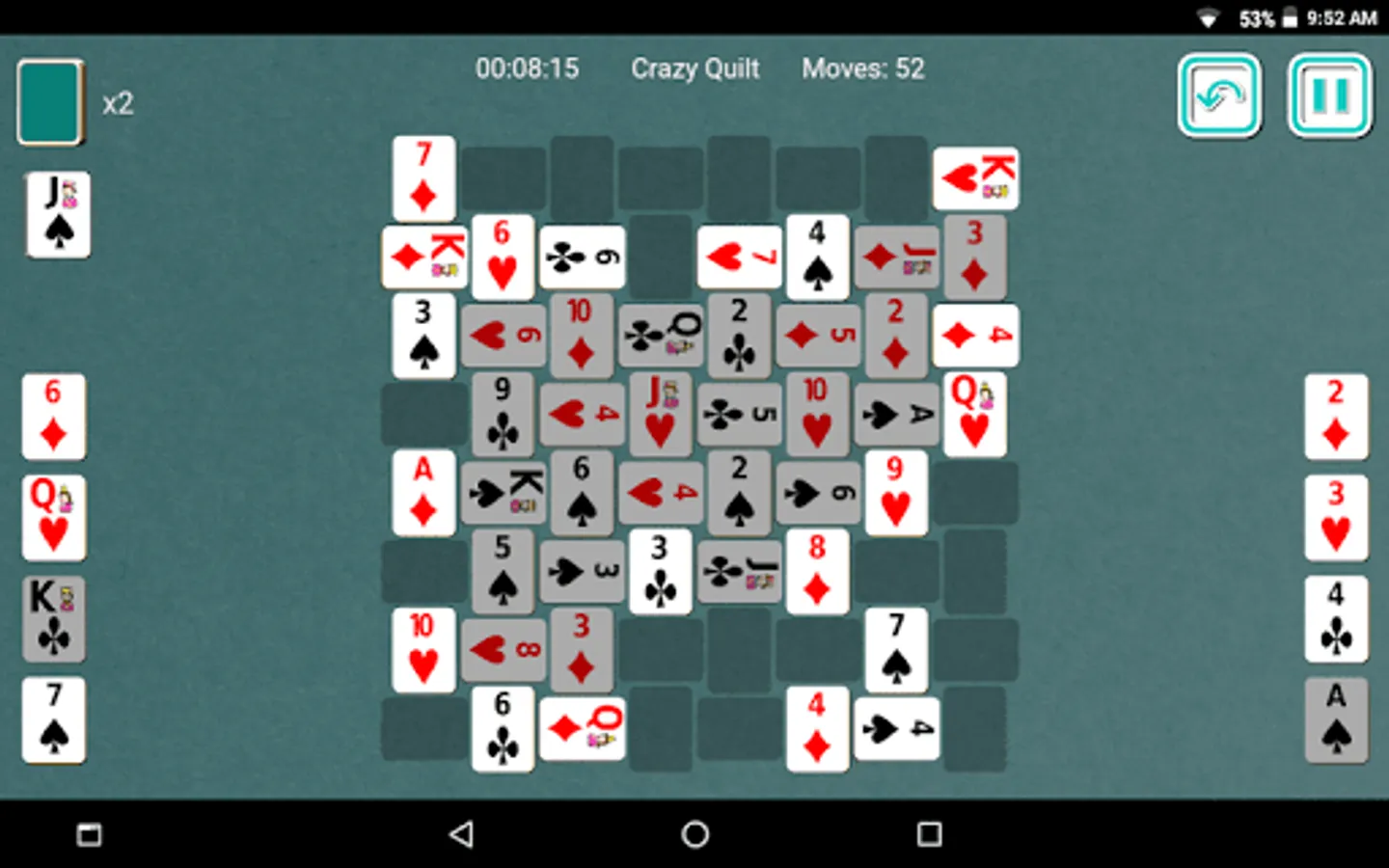 64 cards are dealt face-up to a quilt like setup. Only the cards with at least one short side exposed are available for play in the quilt. Cards from the stock pile can be dealt to the waste pile one at a time. Cards from the quilt and the waste pile can be played to the foundations. Once all cards are moved from stock pile to the waste pile, it can be moved back to the stock pile without reshuffling. This can be done twice in the game.