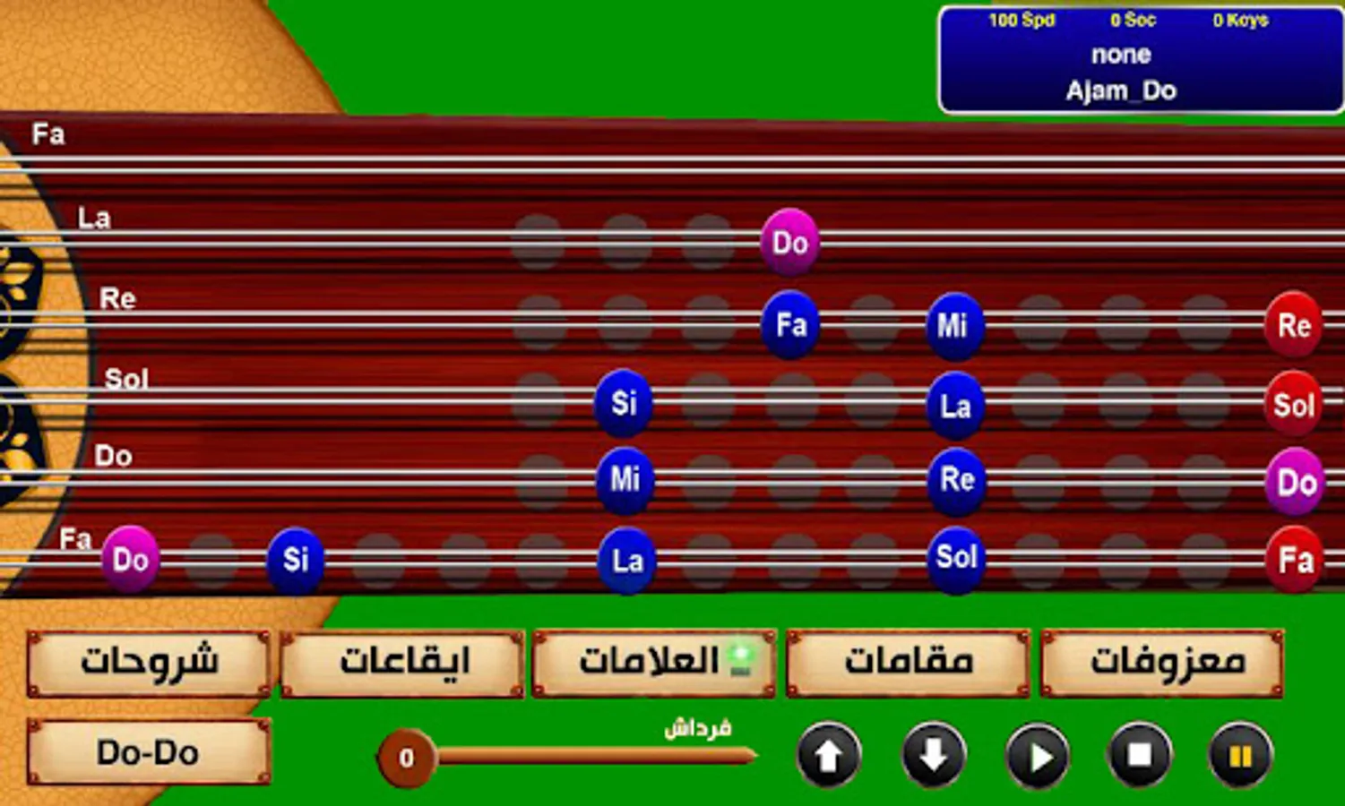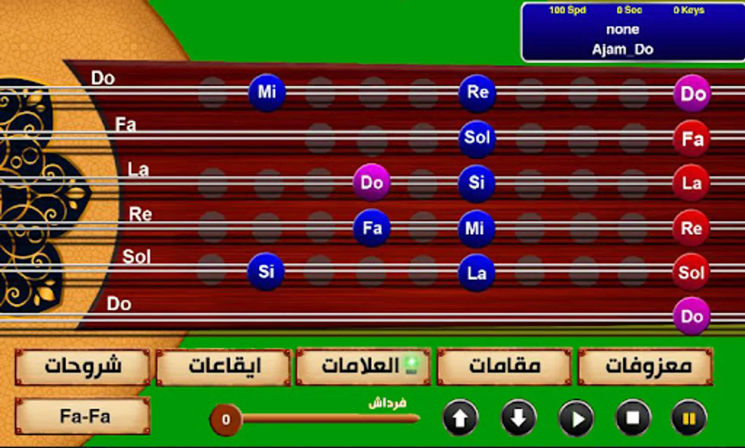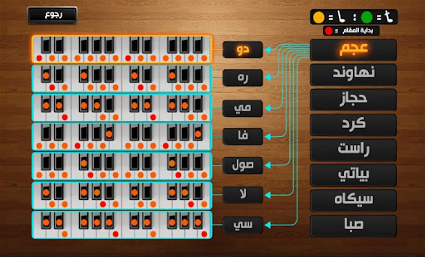 The Arabic Oud application is the perfect choice for those who want to learn oriental maqamat and peace, as it contains features and specifications specific to oriental music, including the eight basic oriental maqamat such as Ajam, Hijaz, Nahawand, Kurd, Rast, Bayati, Sikka, and Saba. The Arabic Oud application contains illustrations of the maqam that help you understand and assimilate the keys and tones of each maqam in any degree, and it also contains quarter tones.