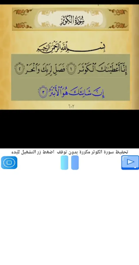 Helps to memorize Surat Al-Kawthar easily, as he repeats the verse three times, and when the surah ends, he re-reads it from the beginning
