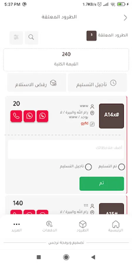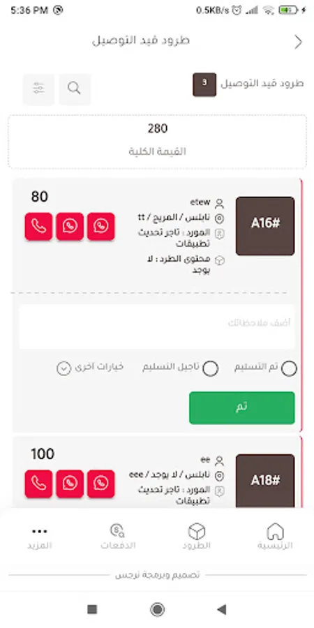 Also, driver users can check list of parcels to be delivered and arranging them based on parcel location or as they like, the user can make a call with customer and check each parcels list based on parcel stage.