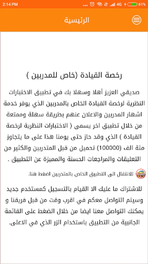 Dear friend, you are welcome to apply the theoretical tests of the driving license for the trainers, which provides the service of publicizing the coaches and advertising them in an easy and enjoyable way through another application called (theoretical tests of the driver's license) who has won to this day over a hundred thousand (100000) downloads from Before the trainees and a lot of good and distinctive comments and reviews about the application.