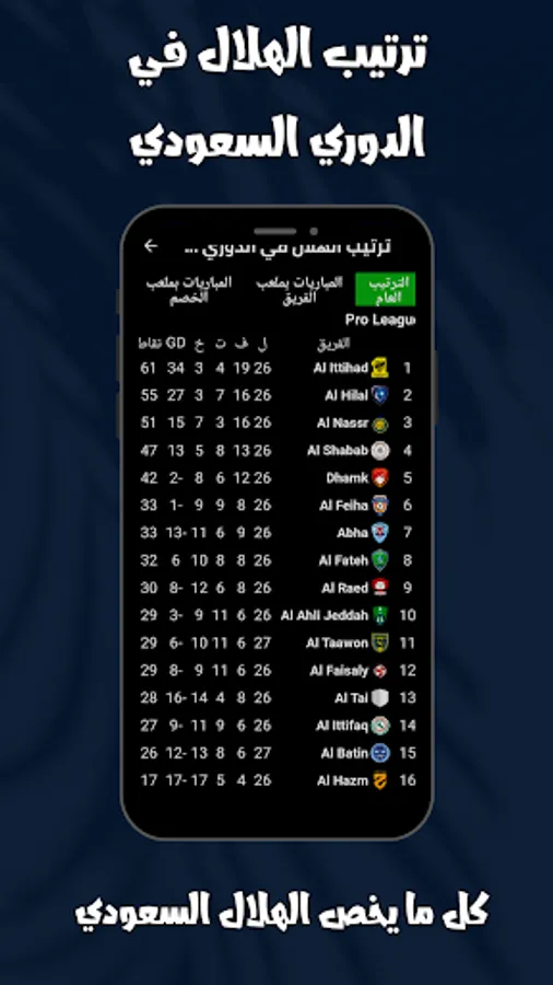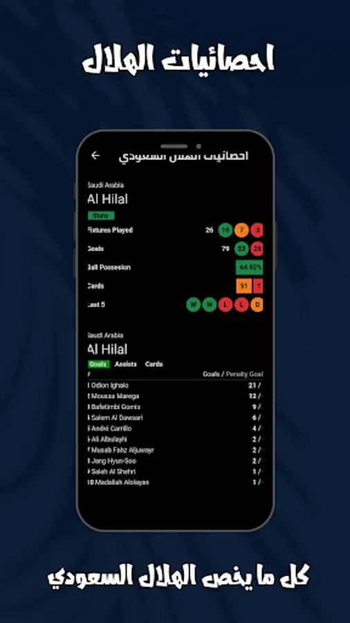 The application of the Saudi Hilal matches - the Saudi Hilal arrangement provides you with the dates of the Saudi Al Hilal matches and the Saudi Al Hilal arrangement in the Saudi League. The application also allows you the statistics of the Saudi Crescent in the Saudi League.