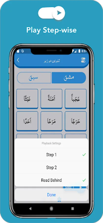 There are two modes included: A listen only mode to go through complete lesson without pauses, And a read behind mode for practicing pronunciation at run time.
