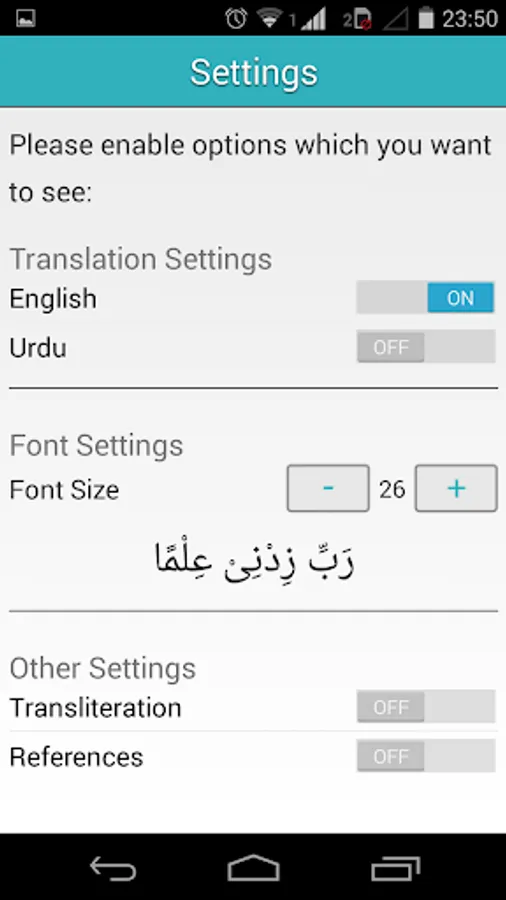 - Transliteration and Translation for each supplication