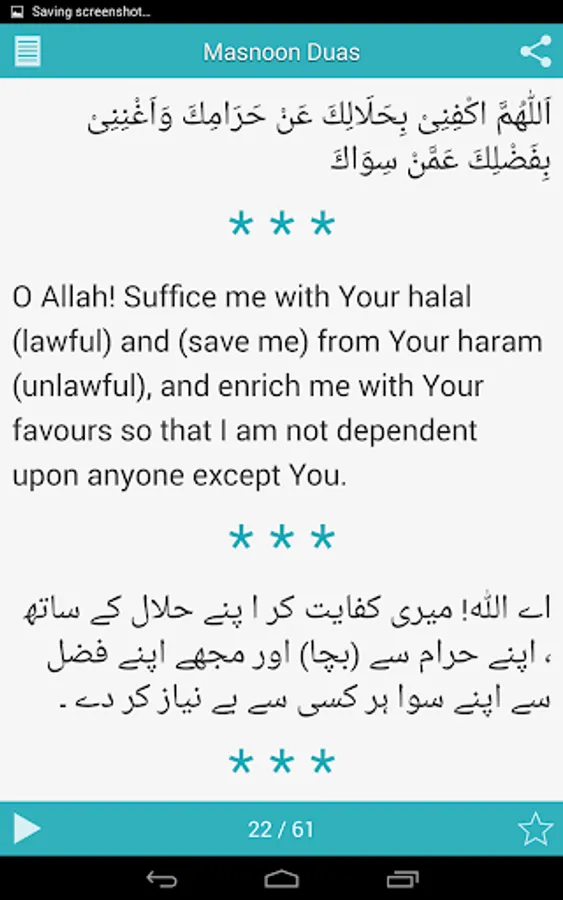Quranic and Masnoon Duas is a collection of supplications collected from the Quran and Sunnah. These beneficial supplications from the Qur’an and authentic Hadith of the Prophet (peace be upon him), help one protect themselves when afflicted by anxiety, sickness and sorrow. The application is based on the book ‘Quranic and Masnoon Duas' complied by Dr. Farhat Hashmi.