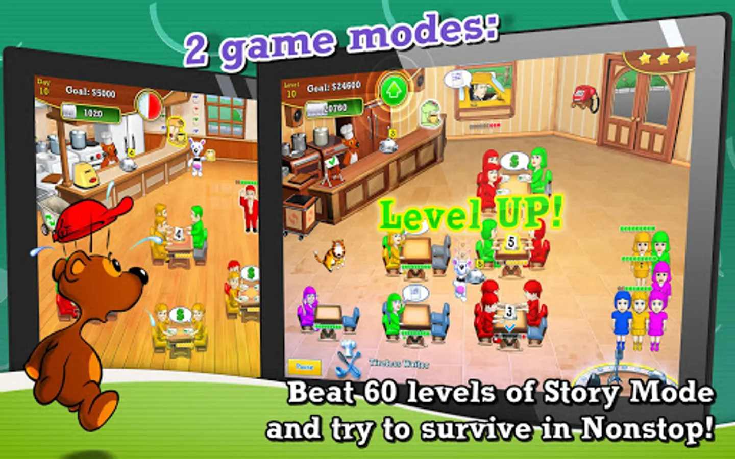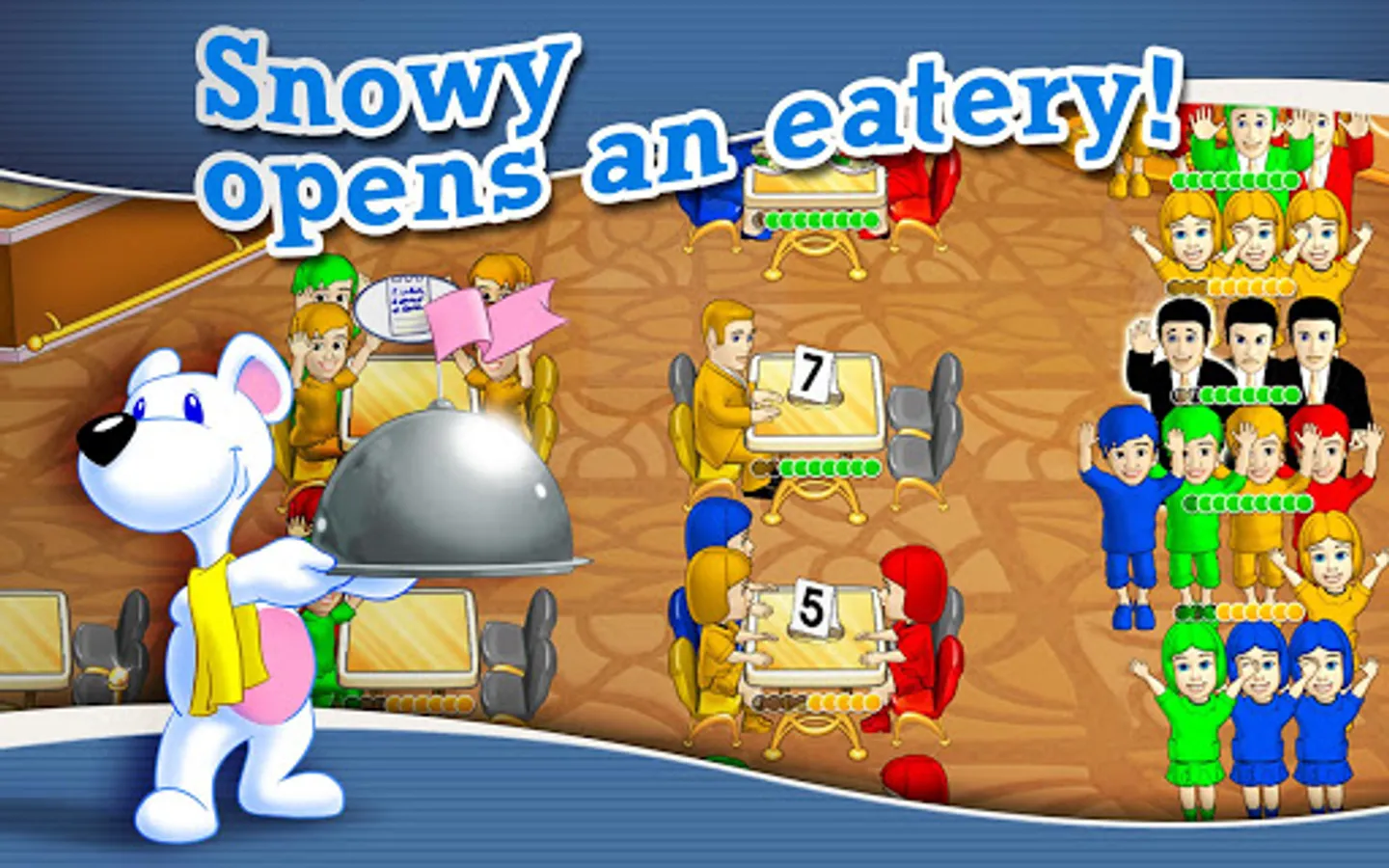 Snowy the Bear opens his own eatery and offers fast-paced yet simple fun. Seat hungry customers, take orders, deal with cooking, serve food, collect cash and clear tables. Match colors, chain actions and keep your customers happy to earn big tips! Deal with VIPs and don't miss impatient drivers.