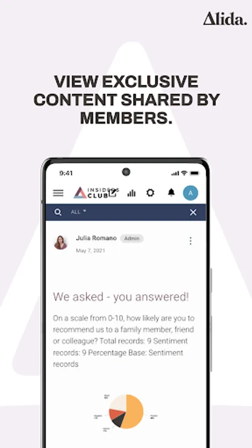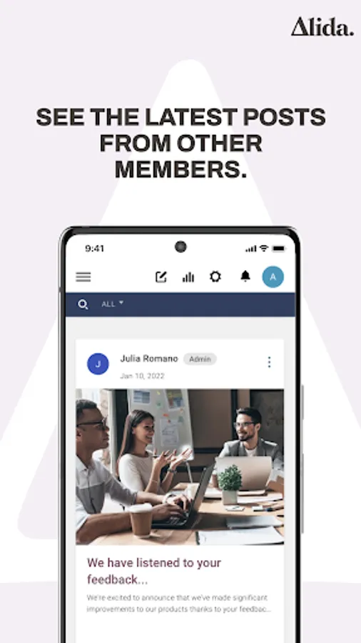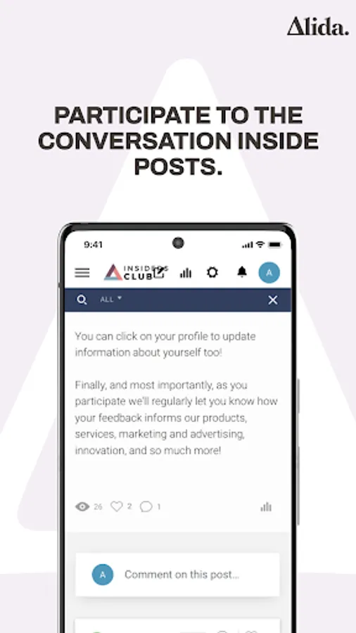 The app enables users to sign in to their Alida community and engage in the community member hubs, various topic forums and allows members to participate in surveys - all from within the app.