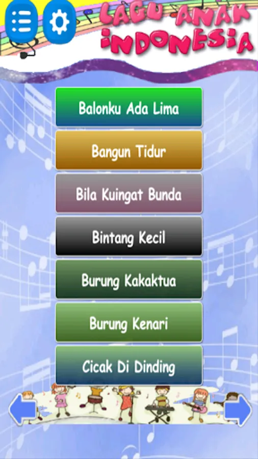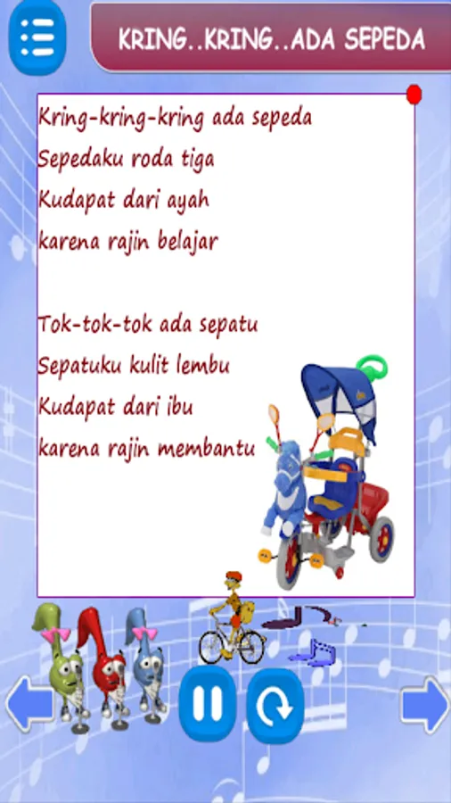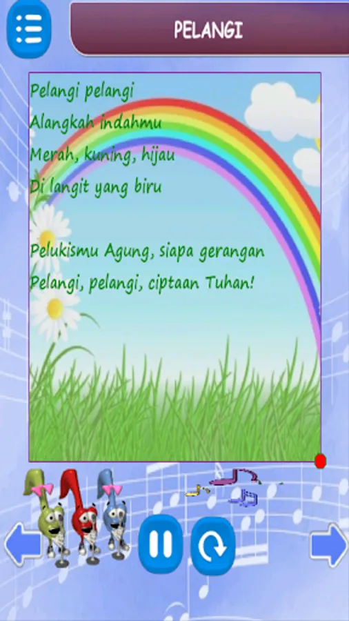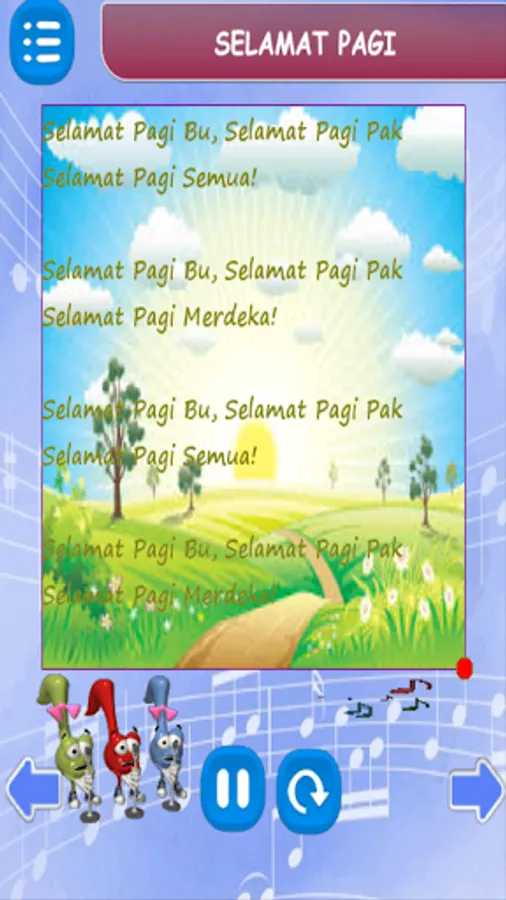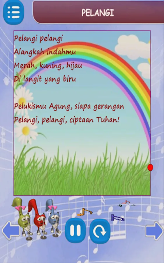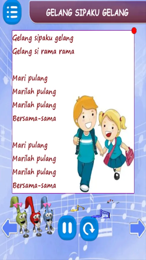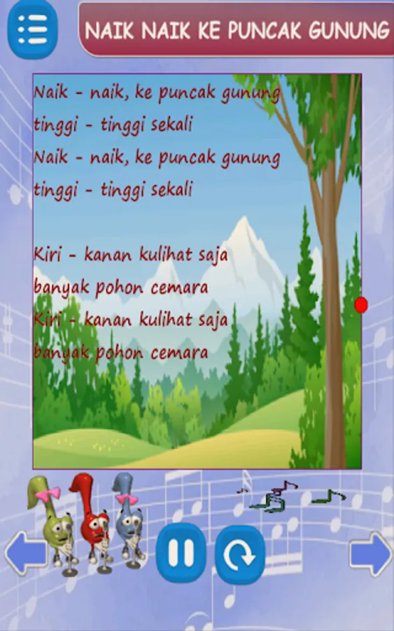 Popular Indonesia Kids Song App is designed with a simple and easy to be used (available play button, pause, repeat, back, next song) and comes with interesting lyrics and animations.