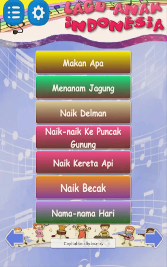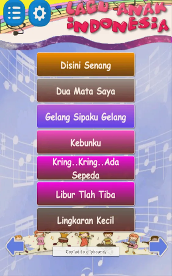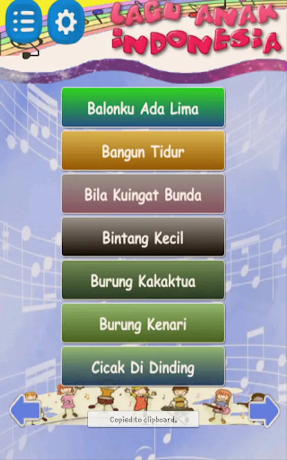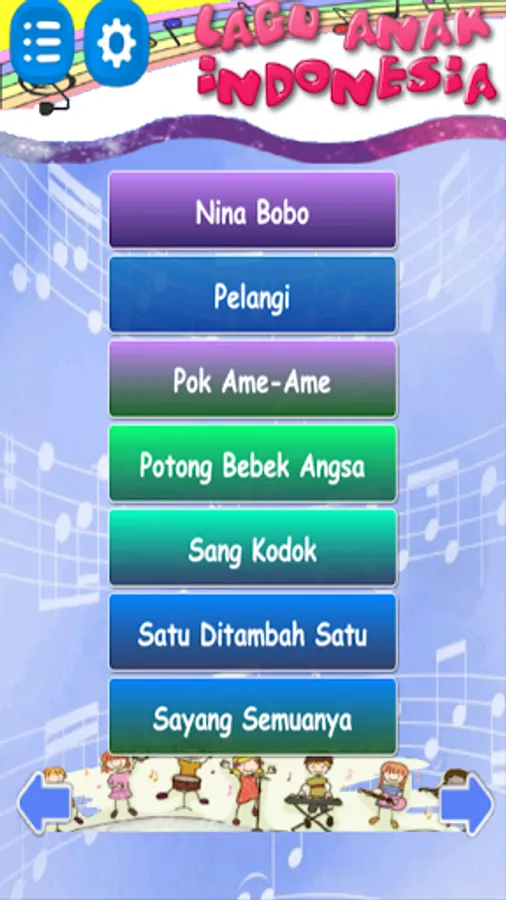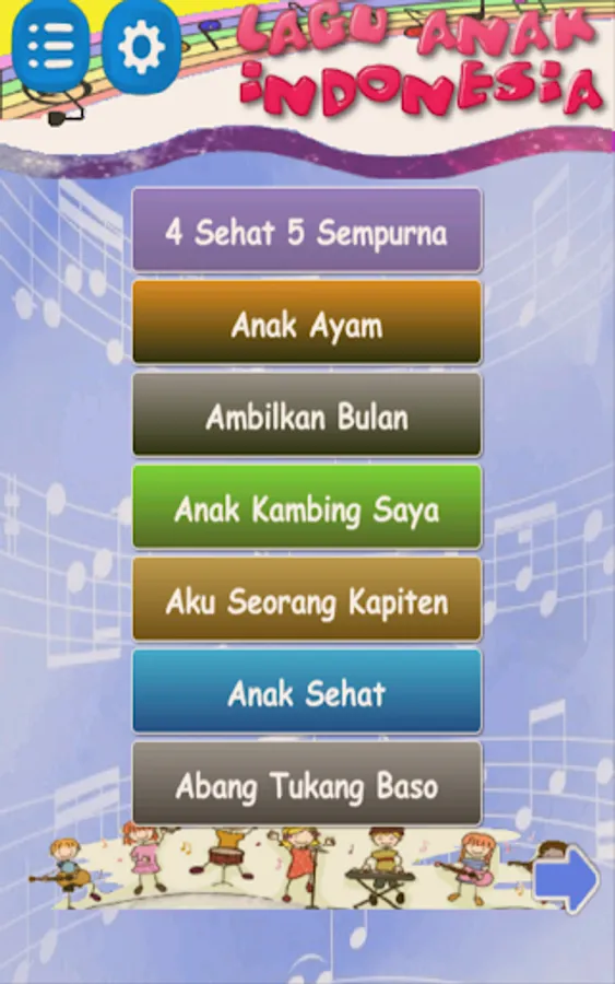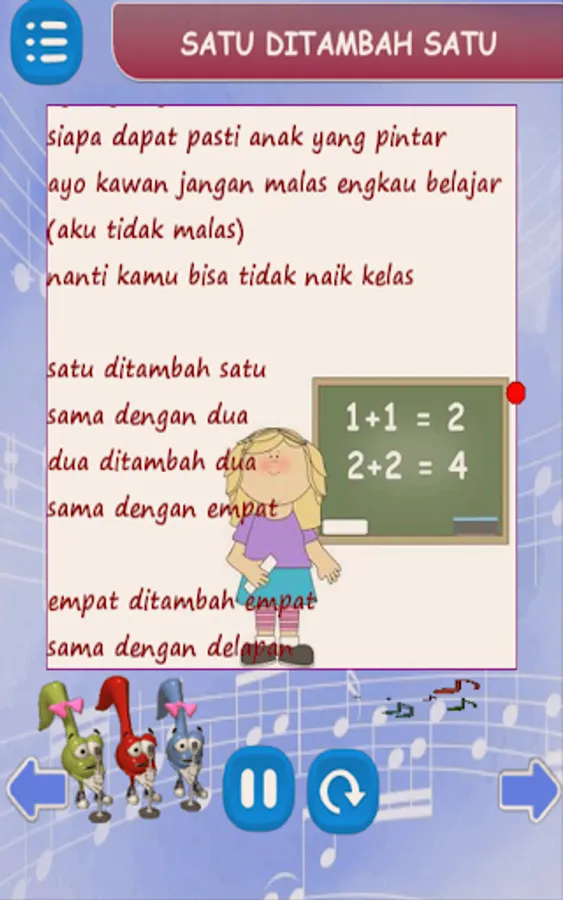 Popular Indonesia Kids Song App is designed with a simple and easy to be used (available play button, pause, repeat, back, next song) and comes with interesting lyrics and animations.