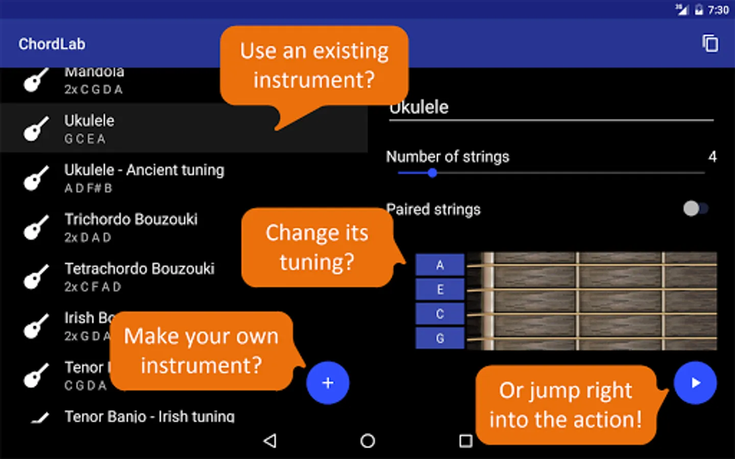 No matter if it's a Guitar or a Chinese Liuqin... No matter if it's a Mariachi Vihuela, an Italian Chitarra Battente, or even an instrument invented by you! No matter if it's with a standard tuning or any tuning you decide to experiment with. ChordLab is the expert for every situation.