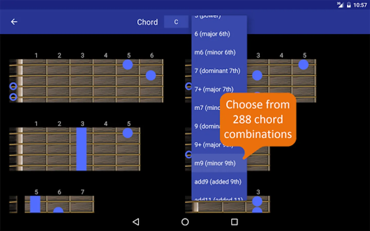 • Choose from 288 chord combinations, including anything from basic chords to folk and jazz chords.