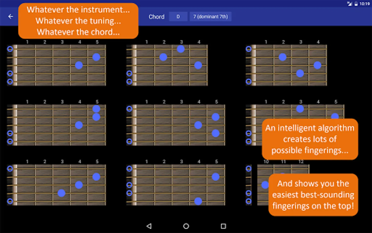 Much more than a chord finder, a universal chord computer that knows the preferences of humans! ChordLab shows you easy and great-sounding fingerings (tabs) for any chord, for any fretted string instrument (chordophone), real or imaginary, and for any tuning you wish.