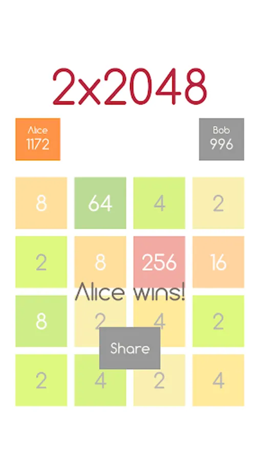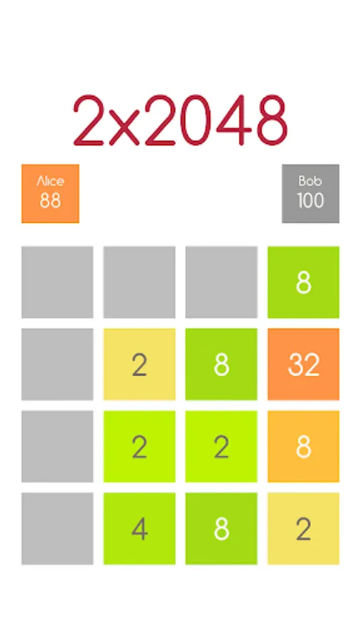 There are many variations of 2048 game, but this one gives you unique opportunity to play with a friend on one device or via local network bringing competition spirit into the game. Simple board design and color selection of tiles make game more attractive. In single player mode you can reach up to 8192 tile and after every move "Undo" option gives you possibility to revert back only once.