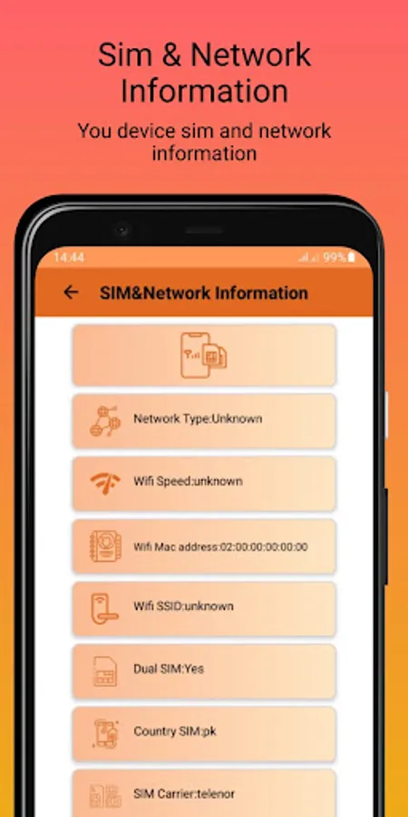 * Such as wifi speed, wifi SSID, wifi mac address, , network type, dual sim info ,carrier info i.e IMEI, IMSI, MCC and MNC, etc.