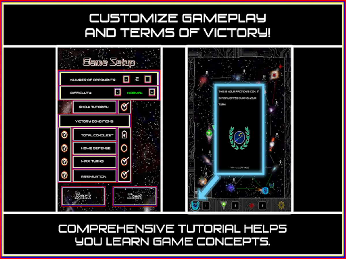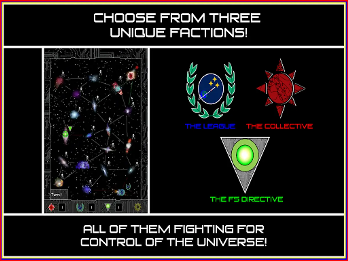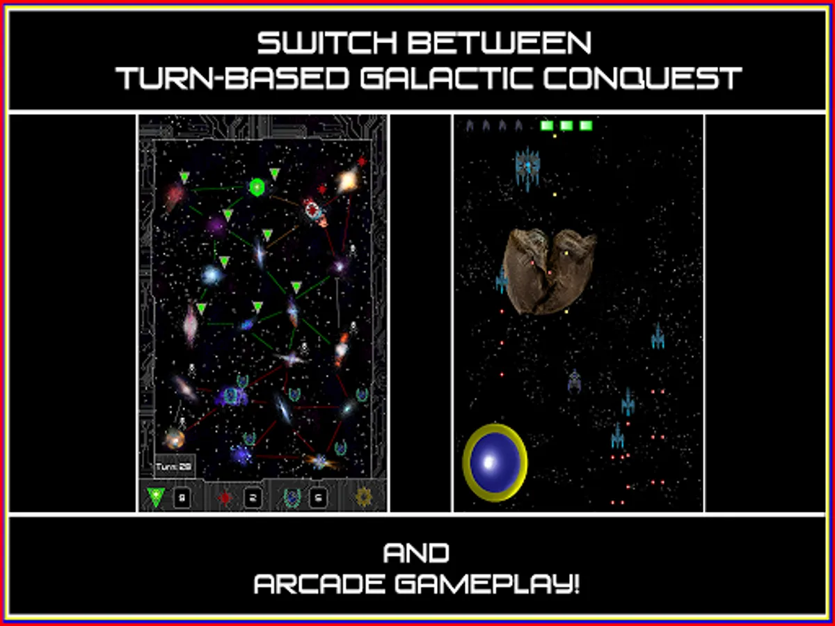 Galaxia Conquestum is a turn-base/arcade game. Select your faction and enter the galaxy map to strategically choose your galaxy to conquer. Then fight in a space arcade scrolling shooter to conquer that galaxy! Be careful, your opponent(s) can also attack you! Defend your galaxy when attacked and bring the fight to your enemy on the next turn!