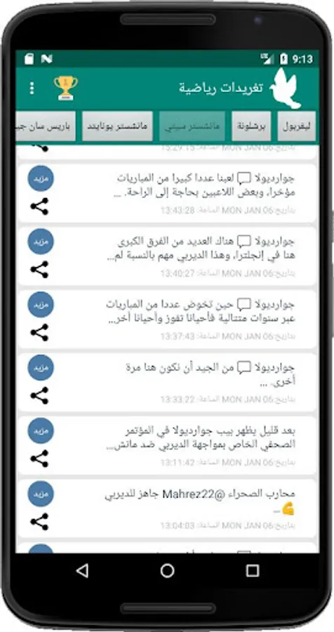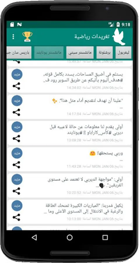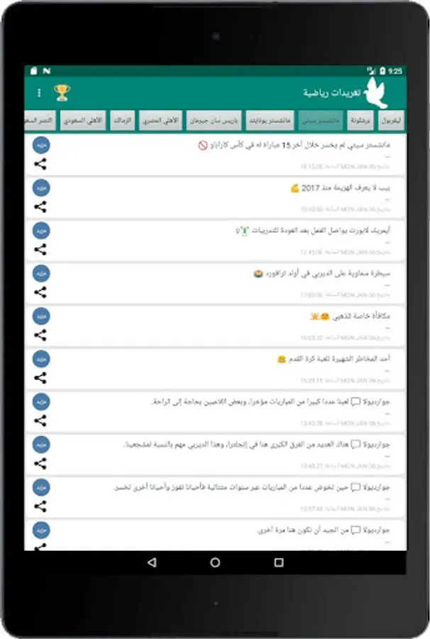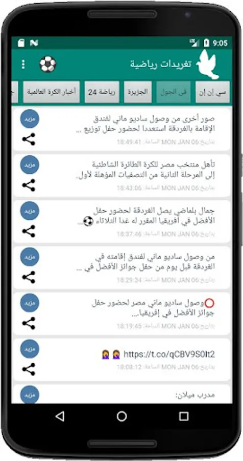 It also displays sports club news from the accounts of Liverpool, Barcelona, Manchester City, Bayern Munich, Roma, Manchester United, Paris Saint-Germain, Al-Ahly of Egypt, Zamalek of Egypt, Al Hilal of Saudi Arabia, Al Ahly of Saudi Arabia, Al Nasr of Saudi Arabia.