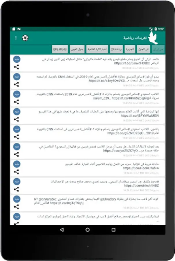 The application displays sports tweets from the accounts between Sport, CNN, Goal, Al Jazeera, Sports 24, World Football News, Arab Goal, and EPL-World.