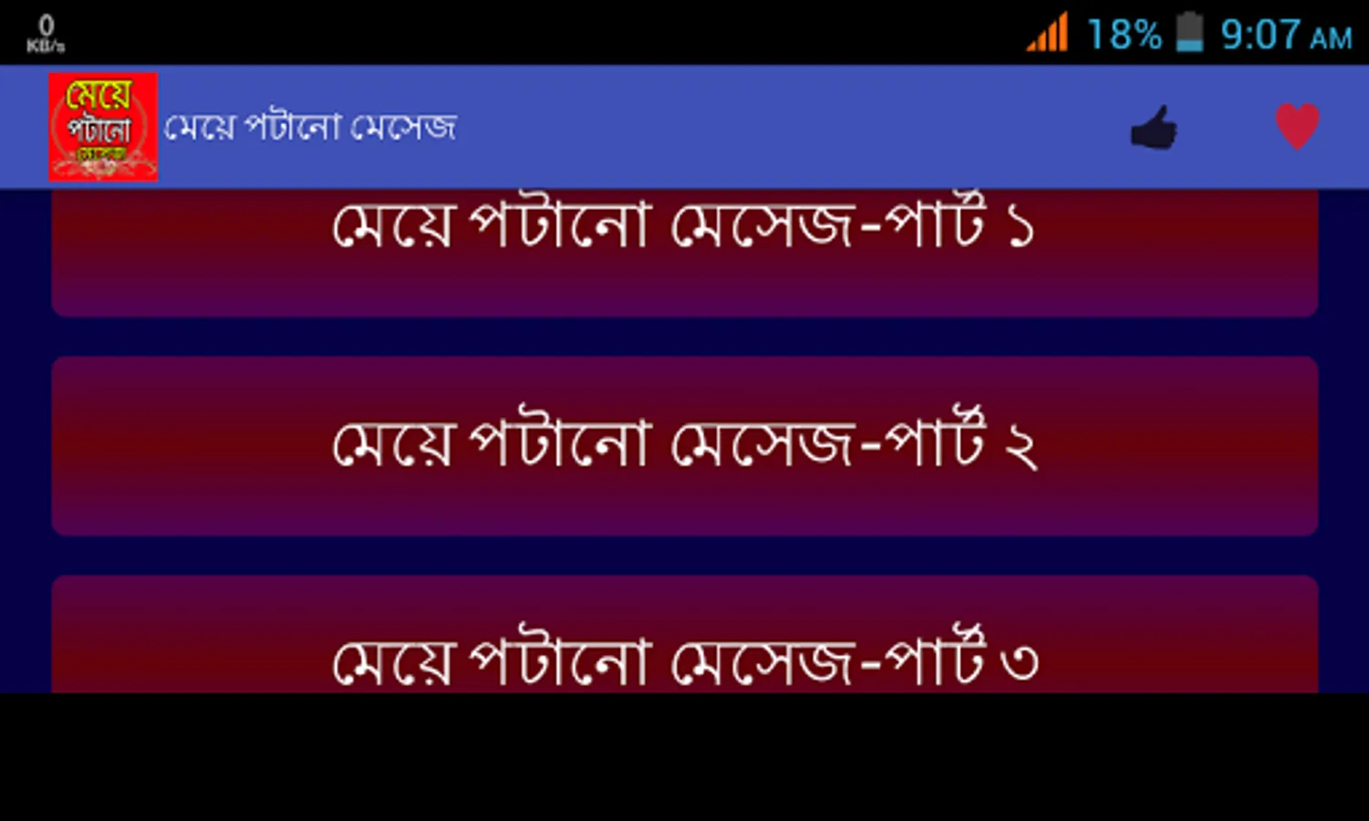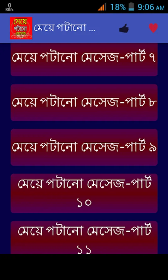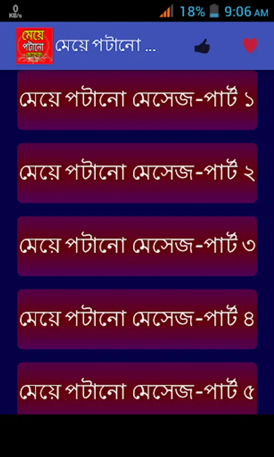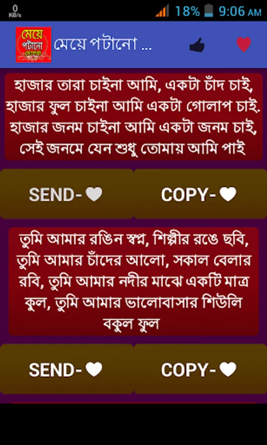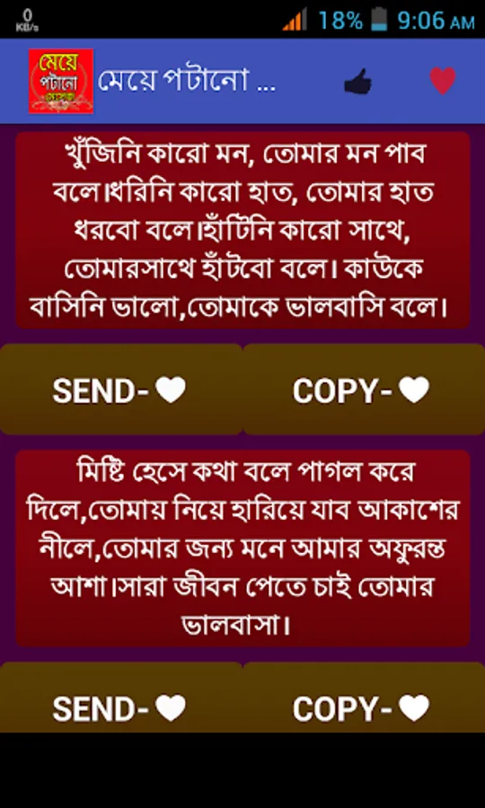 মেয়েদের মন জয় করতে আমাদের বিশেষ আকর্ষন মেয়ে পটানো মেসেজ।প্রেমকে জমিয়ে তুলতে ভালোবাসার মেসেজ বা প্রেমের এসএমএস।। মিষ্টি প্রেমের রোমান্টিক দিনগুলোতে প্রেমের মেসেজ,,, ভালোবাসার sms।। আপনার ভালোবাসার মানুষটিকে সব সময় কাছে পেছে বাংলা এসএমএস,,love sms প্রেম ভালোবাসায় এই এসএমএস কালেকশন মনের মানুষটিকে কাছে টেনে আনবে।। ভালোবাসার শুরু হয় ফেসবুক স্ট্যাটাস থেকে কিংবা প্রেমের কবিতার মত নিজেকে ভালোবাসার উক্তি দিয়ে সাজিয়ে প্রেমের ছন্দের মত নিজেকে রোমান্টিক করতে পারলেই ভালোবাসার জন্ম সেখান থেকেই শুরু হয়।আমাদের এই অ্যাপটিতে পাবেন মনের মানুষকে কাছে পেতে ও তাকে পটাতে মেয়ে পটানো কিছু এসএমএস।।এছাড়াও রয়েছে ভালোবাসায় বিরহ আসলে মনকে হালকা করতে কষ্টের এসএমএস বা কষ্টের স্ট্যাটাস।।
