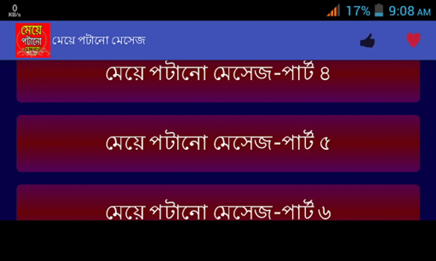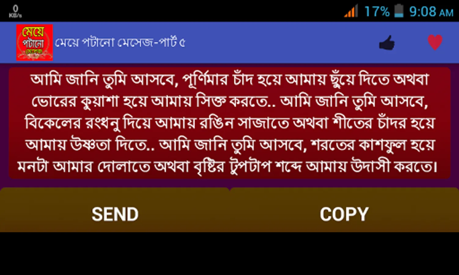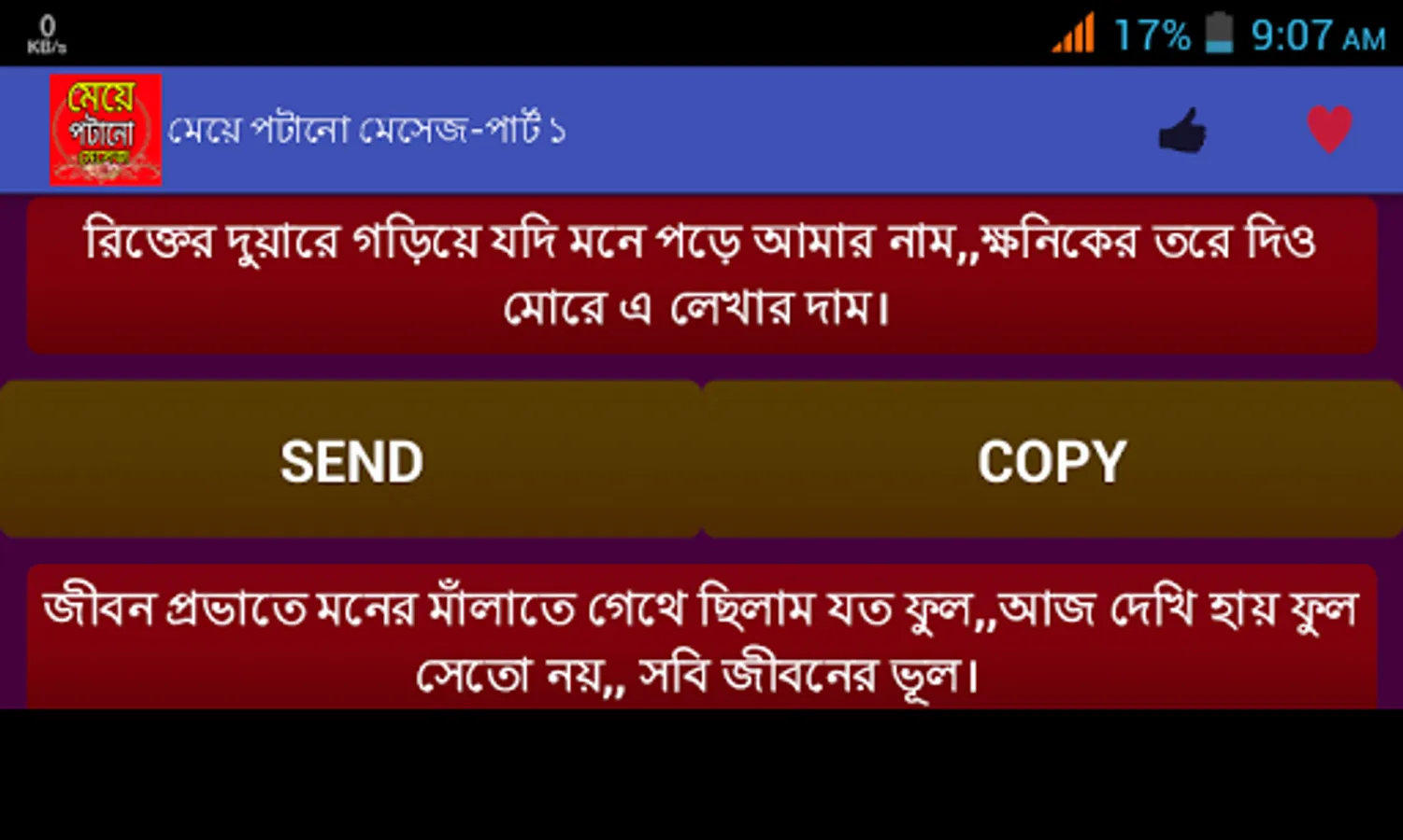 মেয়েদের মন জয় করতে আমাদের বিশেষ আকর্ষন মেয়ে পটানো মেসেজ।প্রেমকে জমিয়ে তুলতে ভালোবাসার মেসেজ বা প্রেমের এসএমএস।। মিষ্টি প্রেমের রোমান্টিক দিনগুলোতে প্রেমের মেসেজ,,, ভালোবাসার sms।। আপনার ভালোবাসার মানুষটিকে সব সময় কাছে পেছে বাংলা এসএমএস,,love sms প্রেম ভালোবাসায় এই এসএমএস কালেকশন মনের মানুষটিকে কাছে টেনে আনবে।। ভালোবাসার শুরু হয় ফেসবুক স্ট্যাটাস থেকে কিংবা প্রেমের কবিতার মত নিজেকে ভালোবাসার উক্তি দিয়ে সাজিয়ে প্রেমের ছন্দের মত নিজেকে রোমান্টিক করতে পারলেই ভালোবাসার জন্ম সেখান থেকেই শুরু হয়।আমাদের এই অ্যাপটিতে পাবেন মনের মানুষকে কাছে পেতে ও তাকে পটাতে মেয়ে পটানো কিছু এসএমএস।।এছাড়াও রয়েছে ভালোবাসায় বিরহ আসলে মনকে হালকা করতে কষ্টের এসএমএস বা কষ্টের স্ট্যাটাস।।