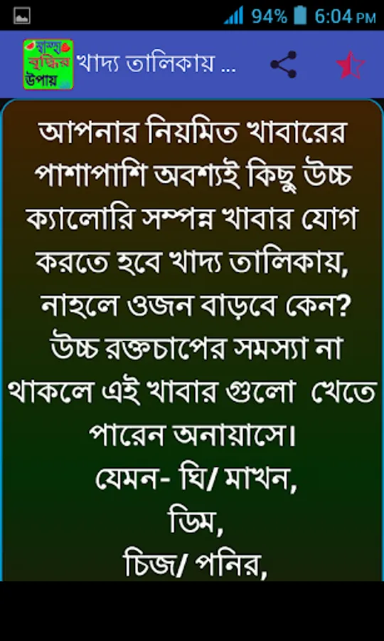 আশাকরি আমাদের অ্যাপটি আপনাদের কাজে আসবে। আসলে সবকিছু মহান আল্লাহ তা'আলার উপর নির্ভর করে। অনেকে আছে খুব স্বাভাবিক খাবার খেলেই মোটা হয়ে যায় আবার অনেকে নিয়ম মেনে খাওয়া দাওয়া করে প্রতিদিন পুষ্টিকর খাবার খায় তাও স্বাস্থ্য মোটা করতে পারেনা।
