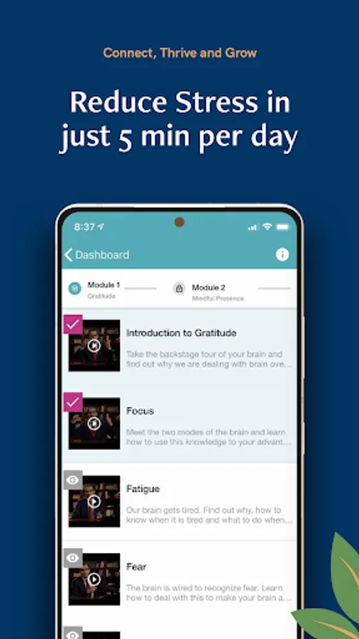 • Short expert, self-paced educational videos on gratitude, mindful presence, resilient mind, and