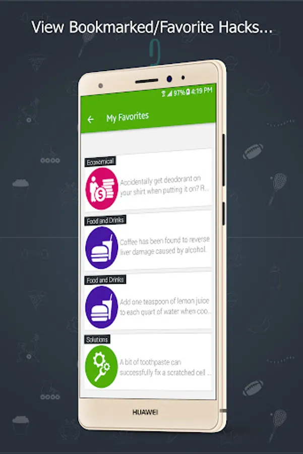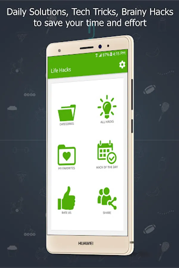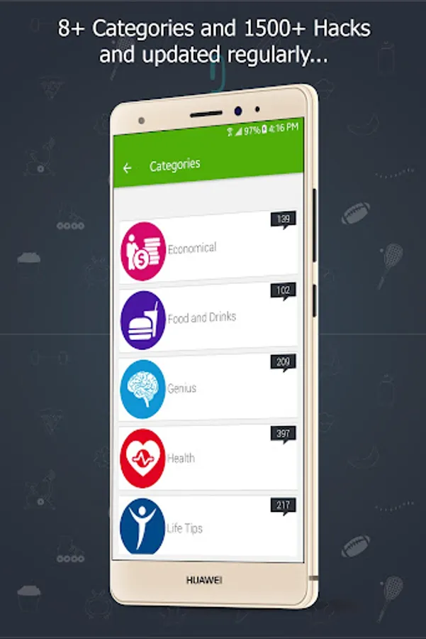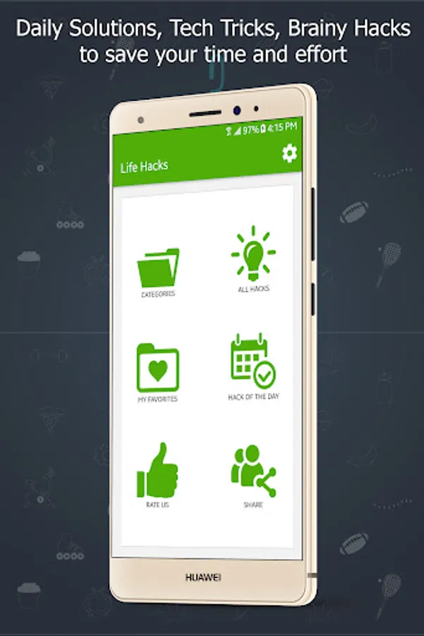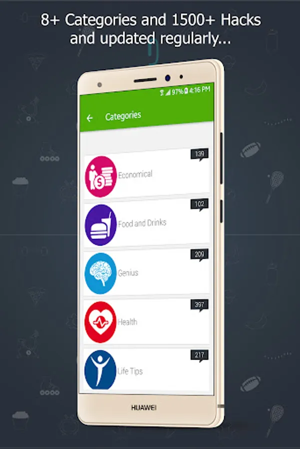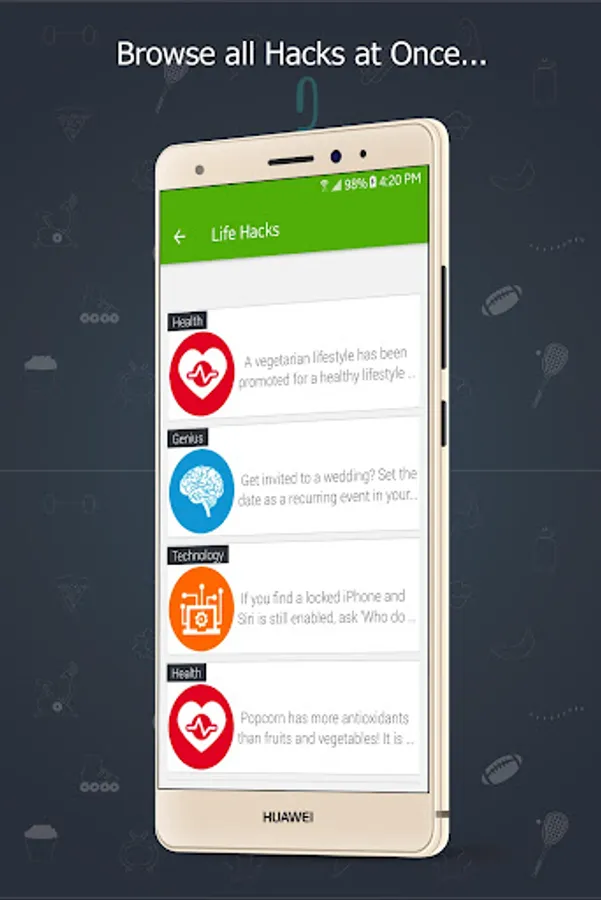 Technology Hacks, Food Tips, Health and Fitness tips, Daily life Hacks, Save money Tricks, Party tips, Survival Hacks, Brainy Hacks and much more combined in one single app.