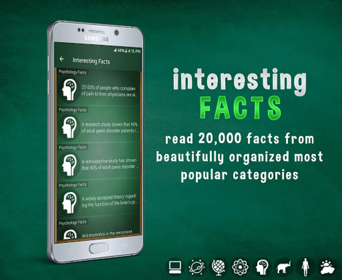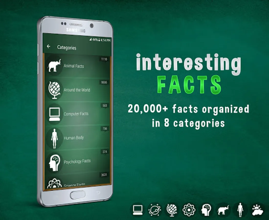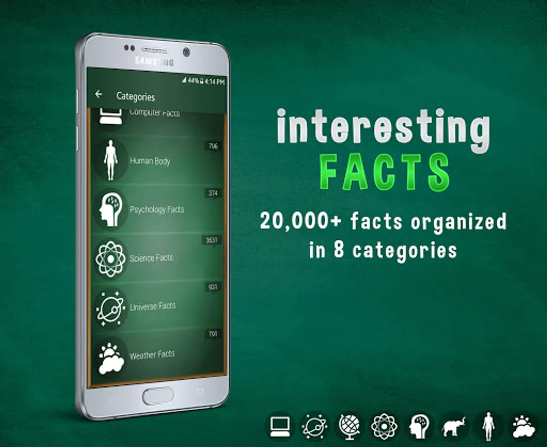 * Various categories of interesting facts available such as Science, World, Universe, Animals, Human Body, Weather, Computers, Psychology etc.