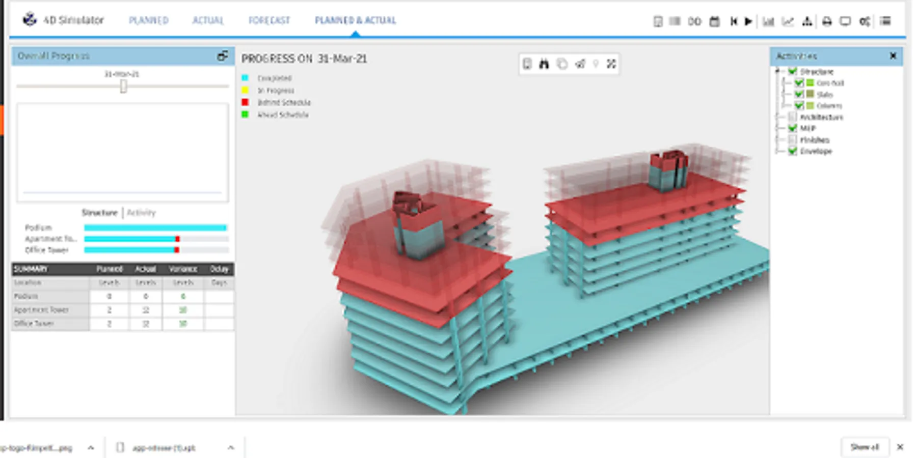 Generate BIM 3D Model of your project effortlessly from the project schedule and a simple general layout drawing. View from any desired angle of the project, its planned or actual progress, on any specified date in the project timeline with the following features: