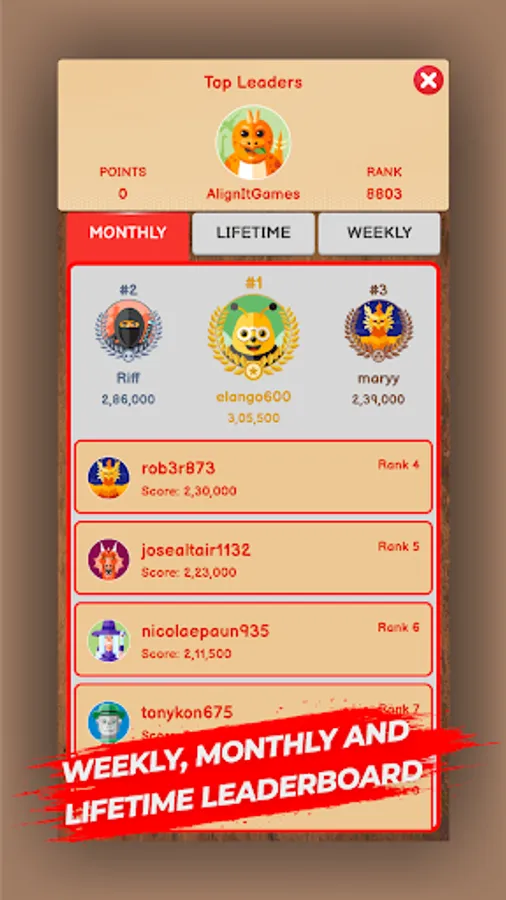 - Monthly, Weekly, and Lifetime Leaderboard