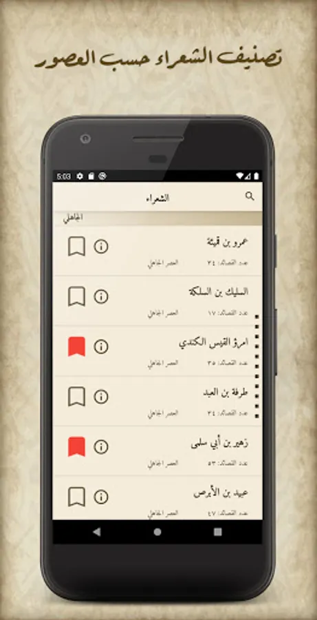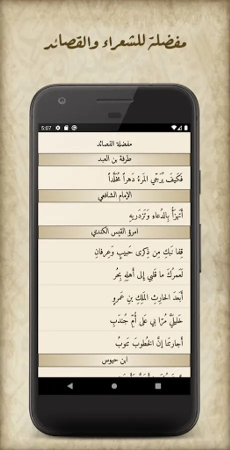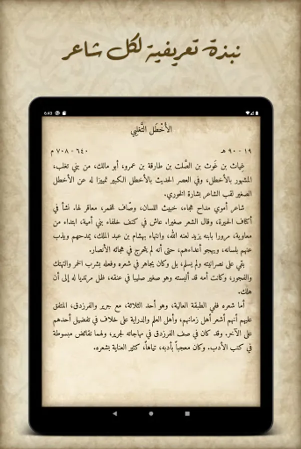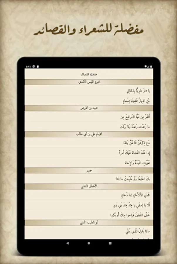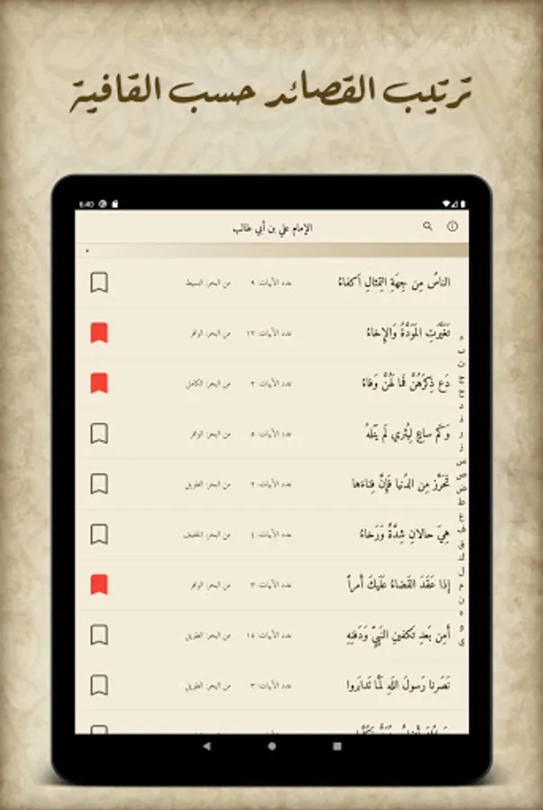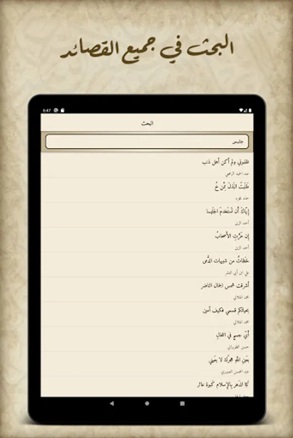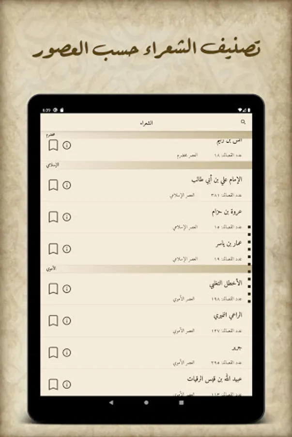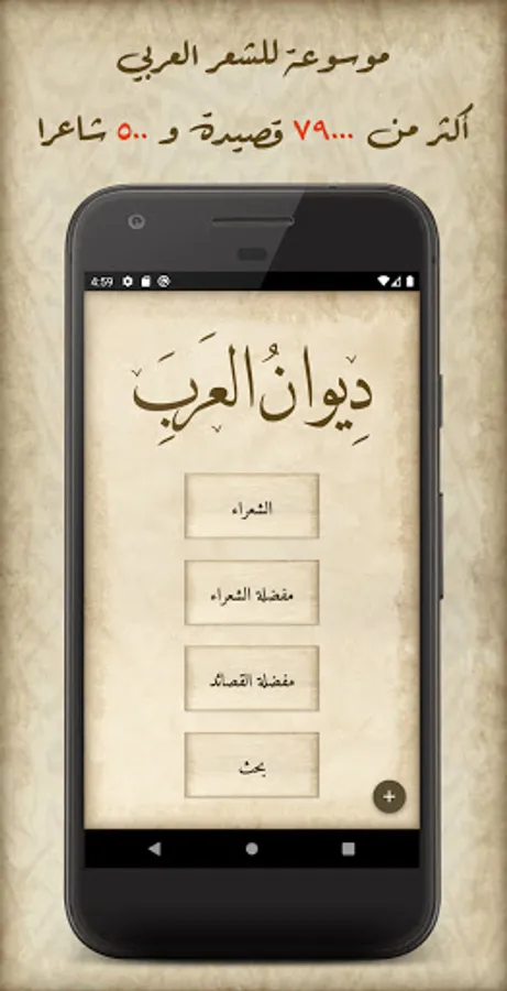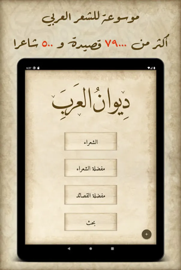Diwan Al Arab - Encyclopedia of Arabic Poetry: An application for smartphones and tablets that does not require an Internet connection, and includes more than 79,000 poems by more than 500 poets, distributed over eleven afternoons, from pre-Islamic to modern, with the ability to search in poets and poems, and share your favorite verses via social media Social, in addition to many other features.