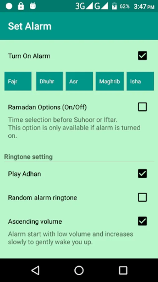 Their is an option of acceding volume, which will play azan or ring tune initially with slow volume and increase volume slowly every ten second to gently wake you up.