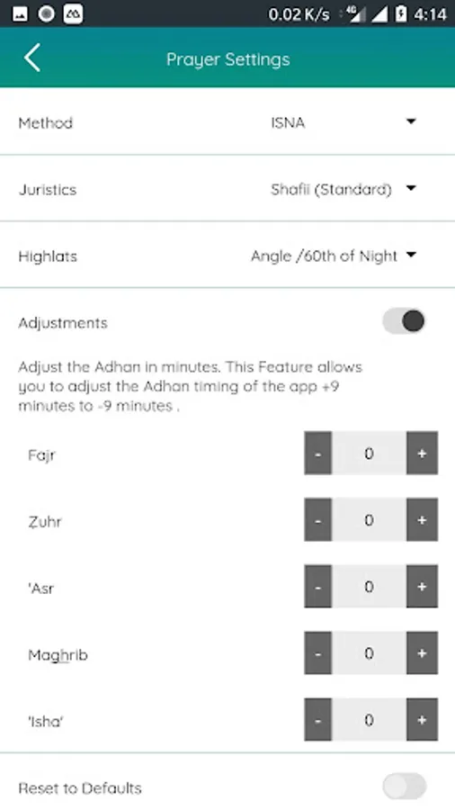 -Individual minute adjustments ranging from +9 to -9 minutes for each prayers.