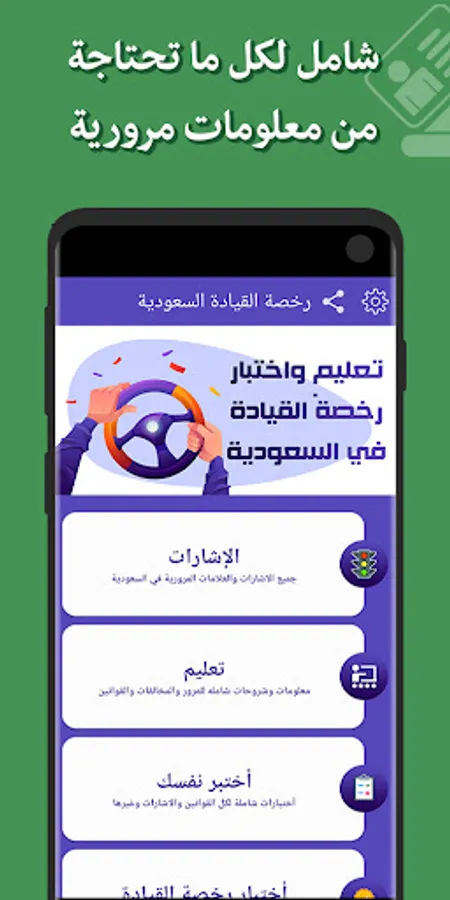 In order to be a skilled driver in the Kingdom of Saudi Arabia, you must be familiar with all the sections of the application that we have, so we have added the signs section and important information such as information about violations and conditions for obtaining a license and also the tests section in order to test yourself easily. We have a driver’s license test for all the information before going to the actual test