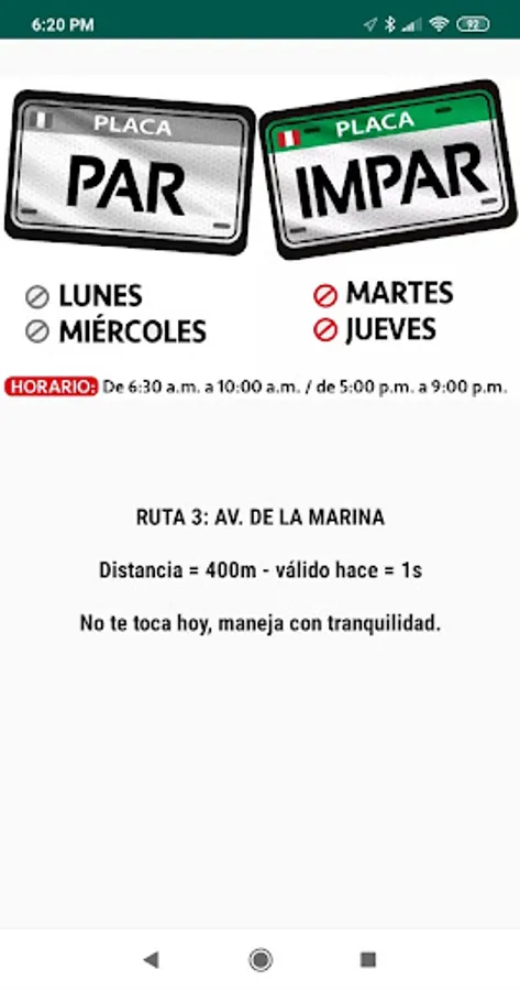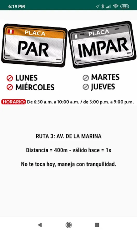 The new vehicle restriction called Pico y Placa in the city of Lima restricts the movement of vehicles of a certain license plate on the days of the week, this application monitors from time to time if it is the day and time of our restriction and if it is the case verifies that no let's be near some restricted way.