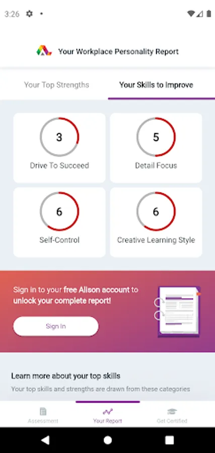 Once you’ve completed this test, you will get a preliminary result. For your full results, all you need to do is create a free Alison account so we can send you the complete report. There are no subscription or sign-up fees to do this - it is completely free!