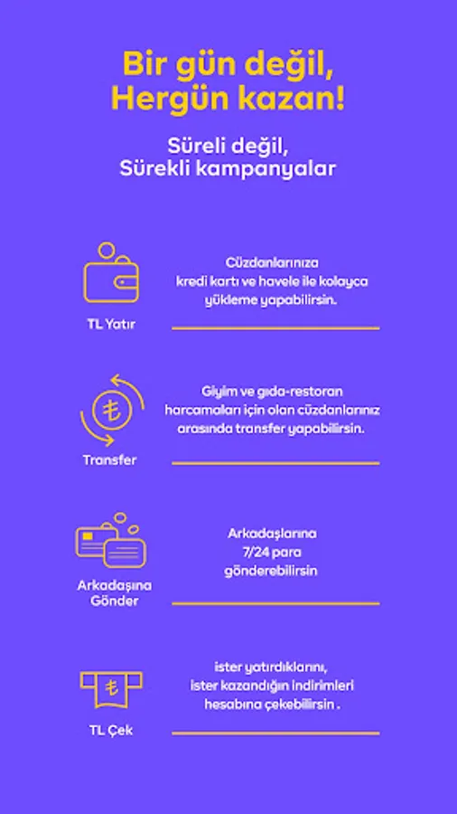 Win every day, not one day, at tens of thousands of points in every category across Turkey. Earn cashback directly, not coins or points. Get these returns in addition to the companies' own discounts and campaigns.