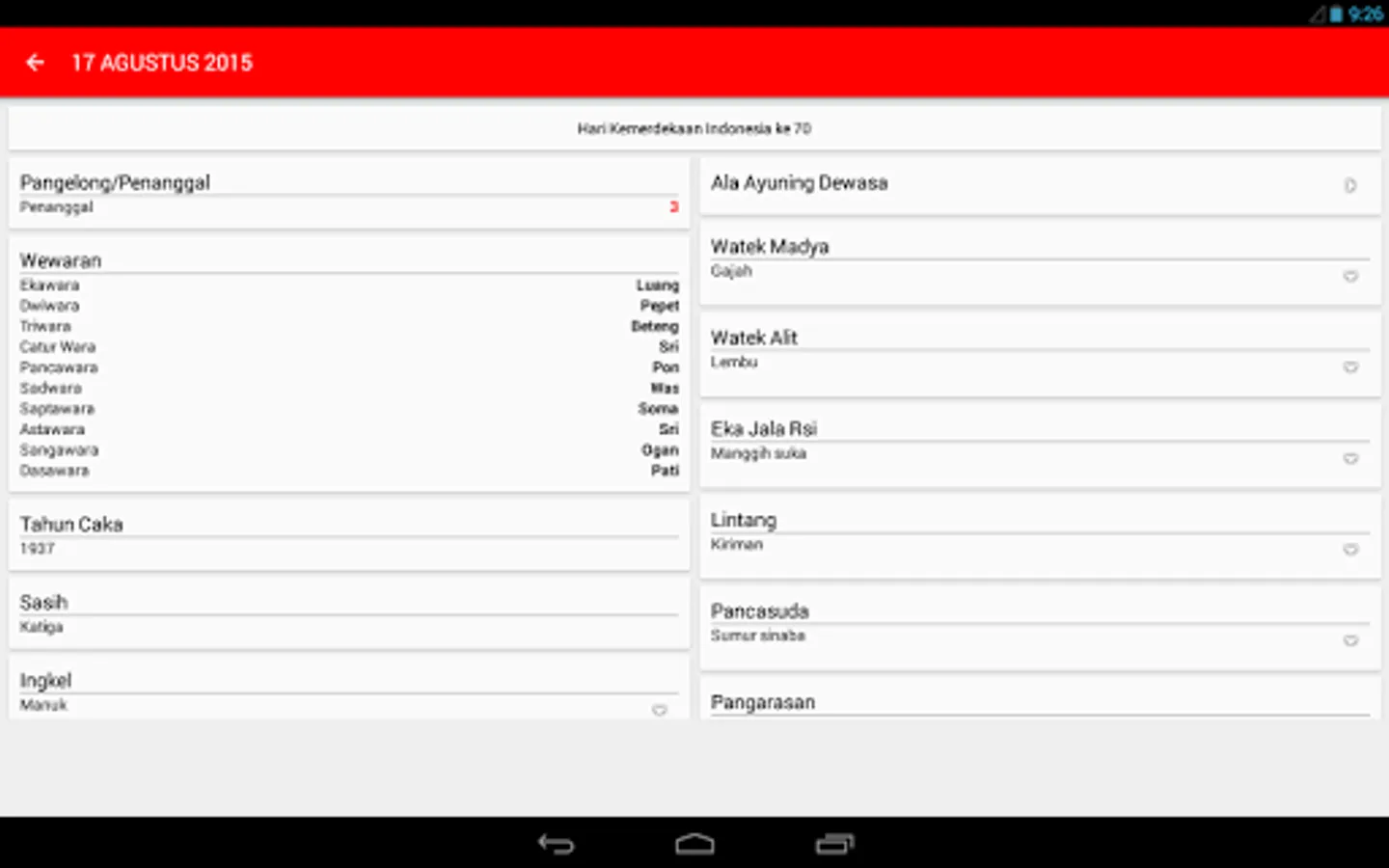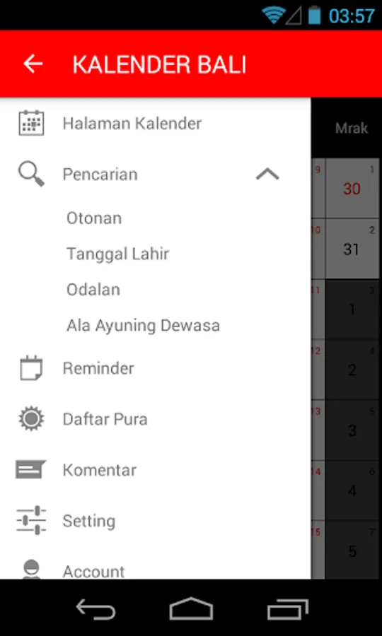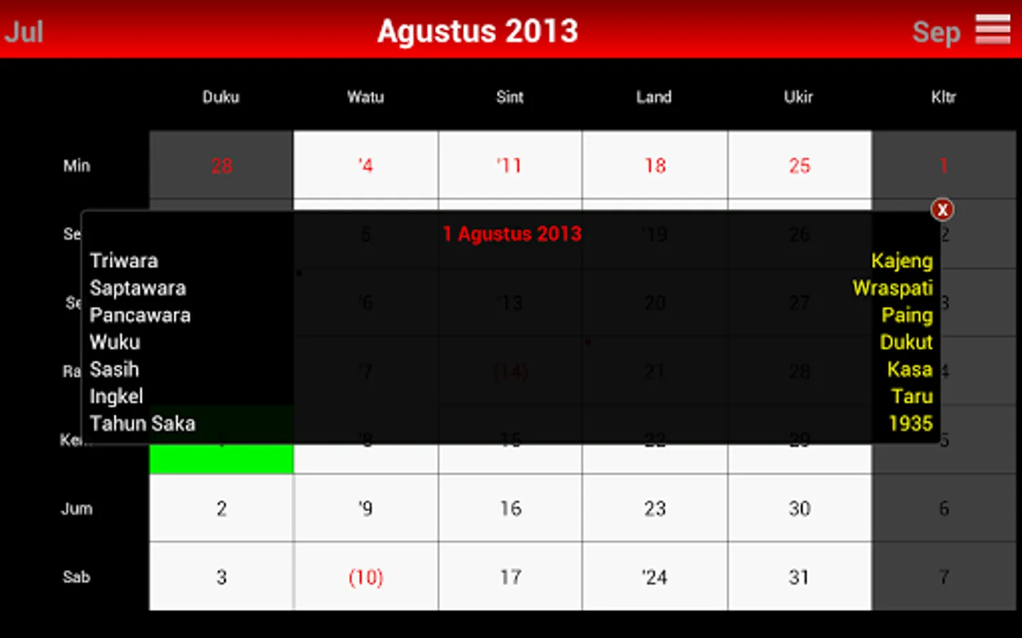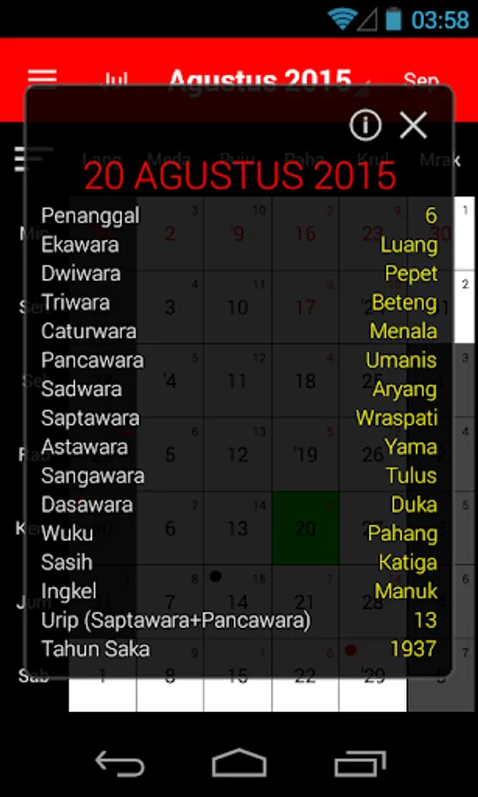 Kalender Bali yang menampilkan kalender dengan informasi - informasi seperti Purnama Tilem, Kajeng Kliwon dan hari raya - hari raya Hindu. Seperti Pagerwesi, Galungan, Kuningan, Nyepi dan lainnya.
