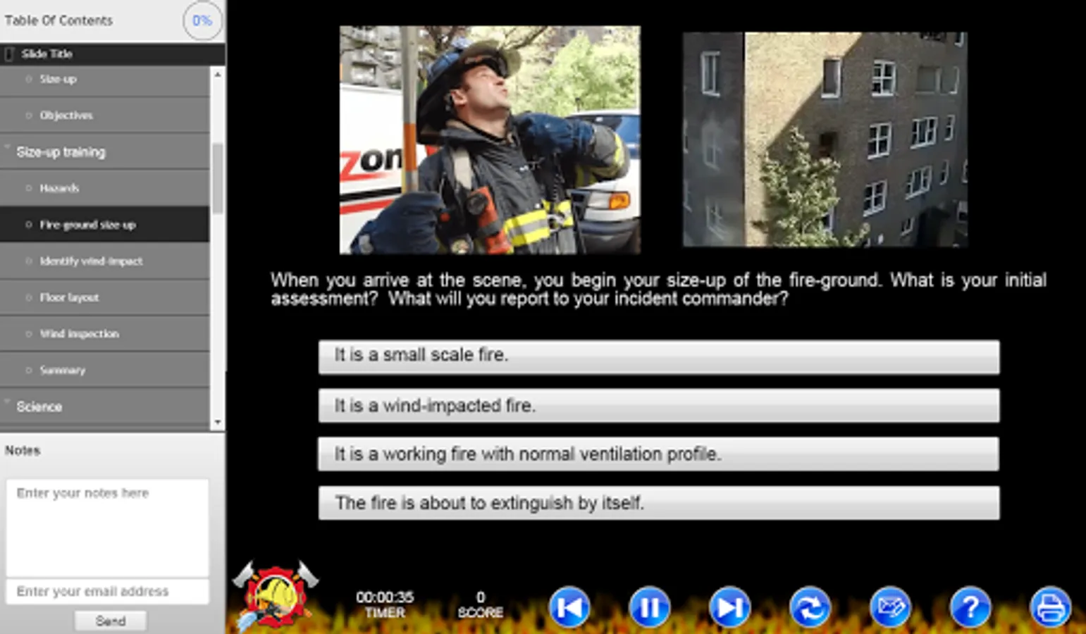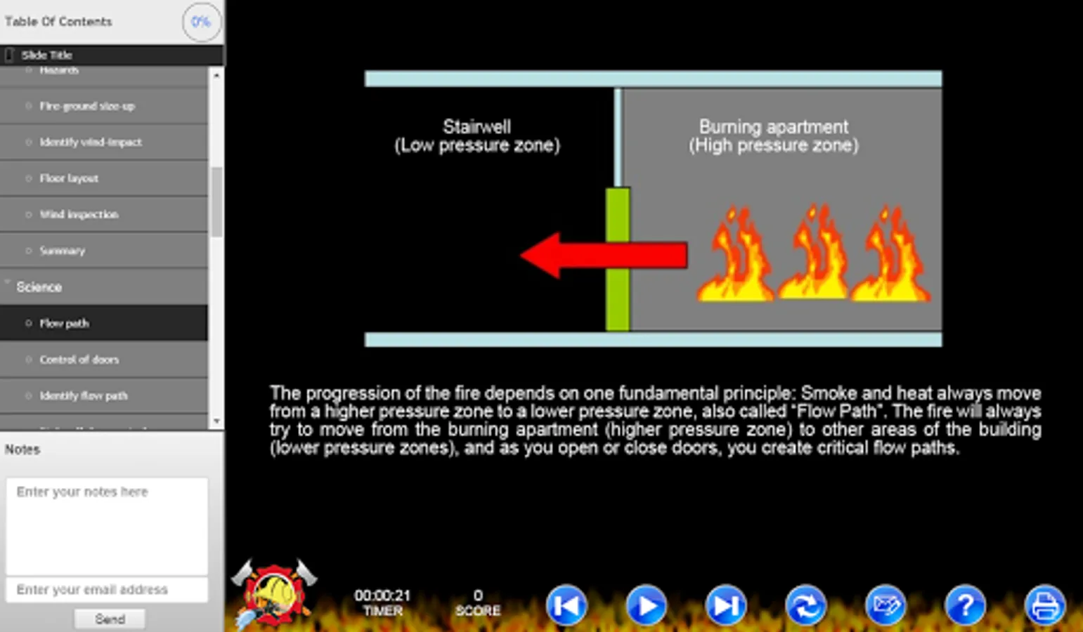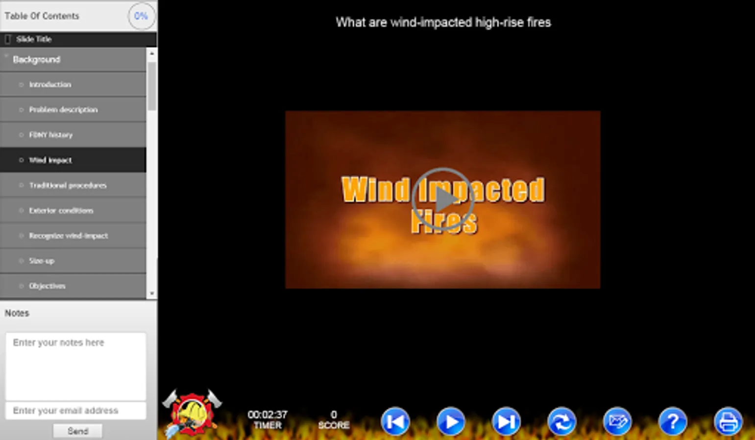 This training module trains the firefighters for new firefighting procedures to fight wind-impacted high-rise fires with improved safety. The efficacy of these firefighting procedures (Positive Pressure Ventilation, Wind Control Device Deployment, High-Rise Nozzle Deployment) was demonstrated research study conducted by New York University, Fire Department of New York and National Institute of Standards and Technology. This application includes the videos and images of the live burn experiments and scientific simulations conducted a part of this research study.