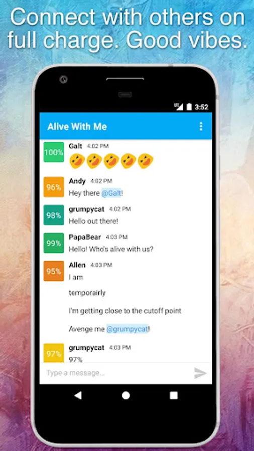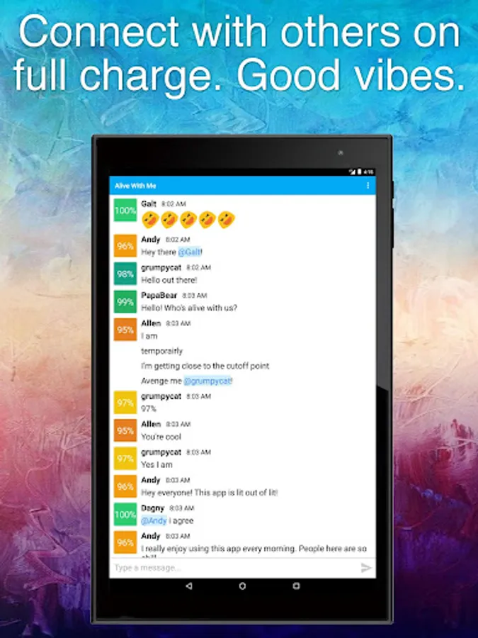Join those who live life to the fullest by downloading Alive With Me. It's an anonymous group chat that requires at least 95% charge to send messages. Instead of death and taxes, we cherish life and prosperity.