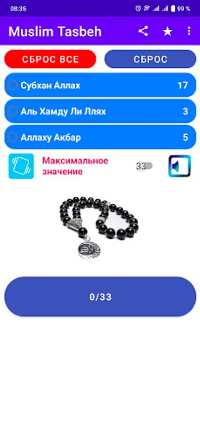 Приложение "Muslim Tasbih" посчитает зикр "Субхан Аллах", "Аль Хамду Ли Ллях" и "Аллаху Акбар". Автоматически изменяется позицию по каждый 33 или 99. Вы можете включать и выключать вибрацию и звук.