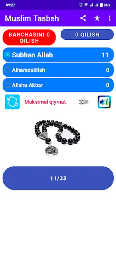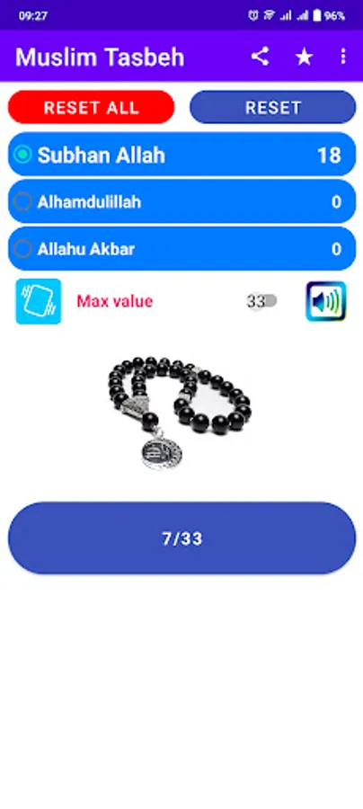 The application "Muslim Tasbih" will count dhikr "Subhan Allah", "Alhamdulillah" and "Allahu Akbar". The position is automatically changed for every 33 or 99. You can turn on and off vibration and sound.