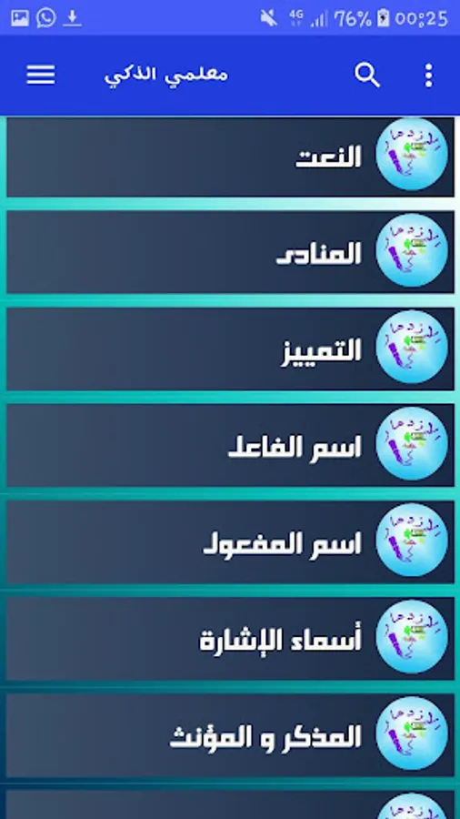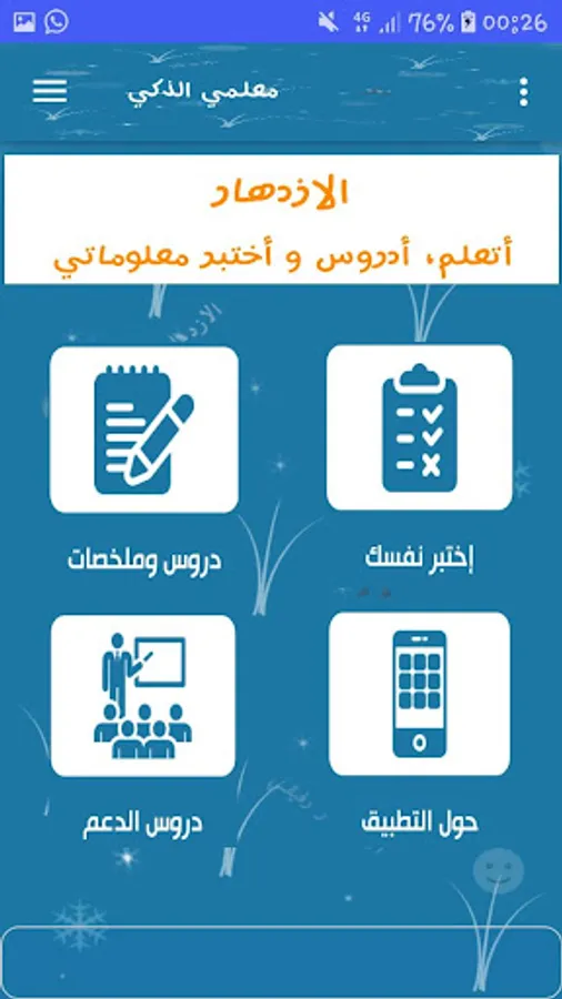 تطبيق معلمي الذكي تطبيق موجه لدعم التلاميد في دروس اللغة العربية حيت يتضمن مجموعة من الدروس المتدرجة من السهلة إالى. كما يتضمن اختبار حول مكتسبات المتعلم