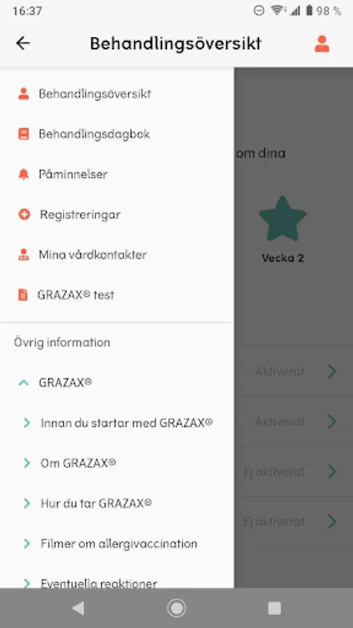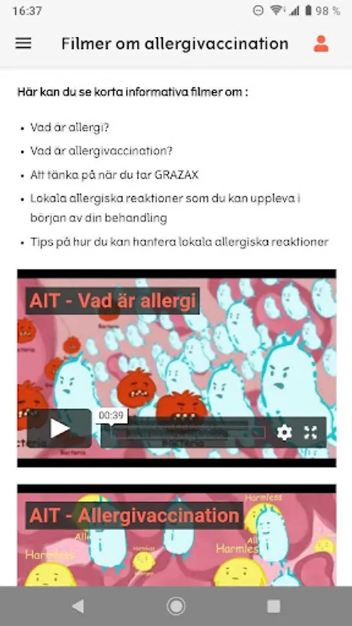 This is an app for those who have been prescribed tablet allergy vaccine (GRAZAX®, ITULAZAX® or ACARIZAX®). The app gives you the right support at the right time, throughout the processing time. You log in with item number (Vnr), which you will find on the front of your medicine pack.