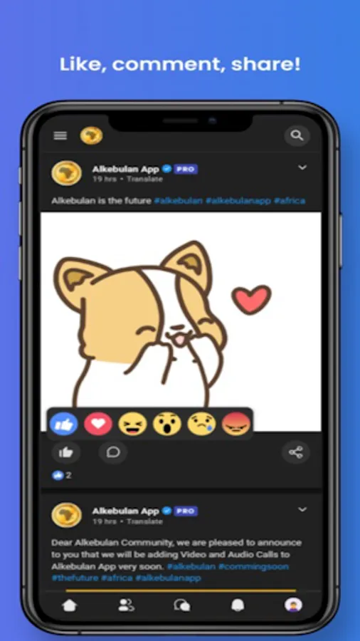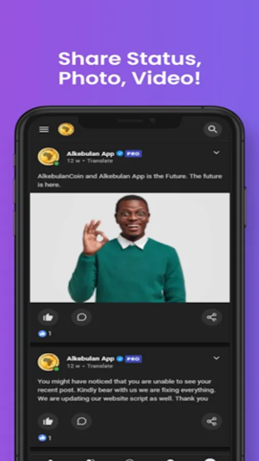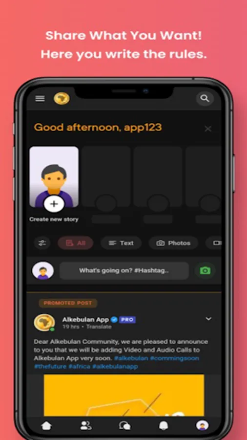 On Alkebulan users share their views with friends, family and people you may know. You can also share, photos, videos, audios and products, users can also write and publish articles, create groups and pages.