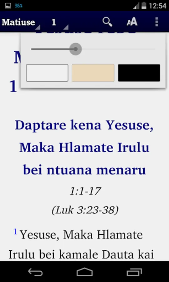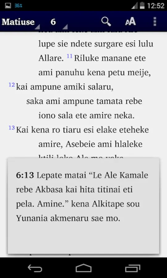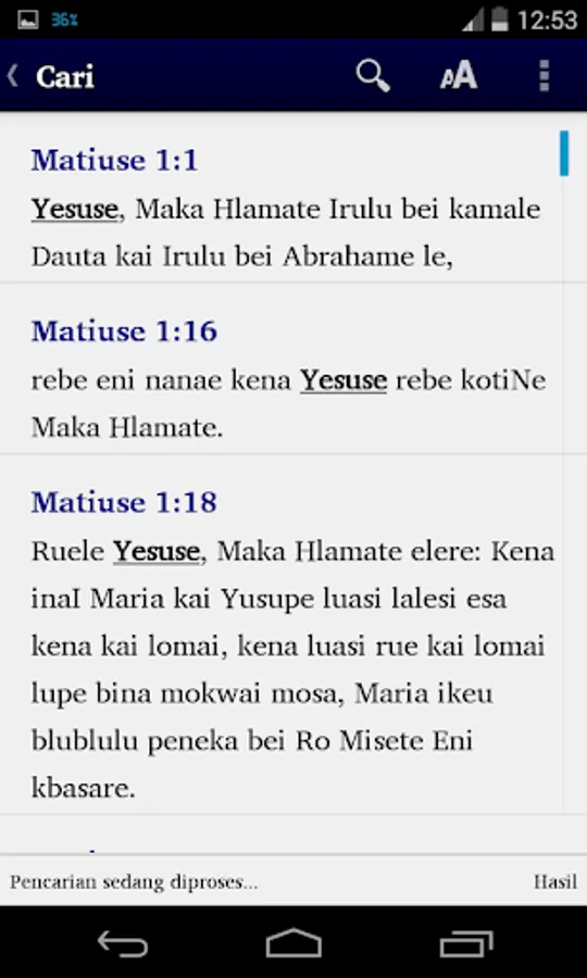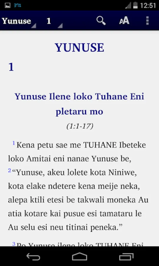 Alune Bible app for Android. Contains complete New Testament and serveral Old Testament books in the Alune language. Available for free to download and use.