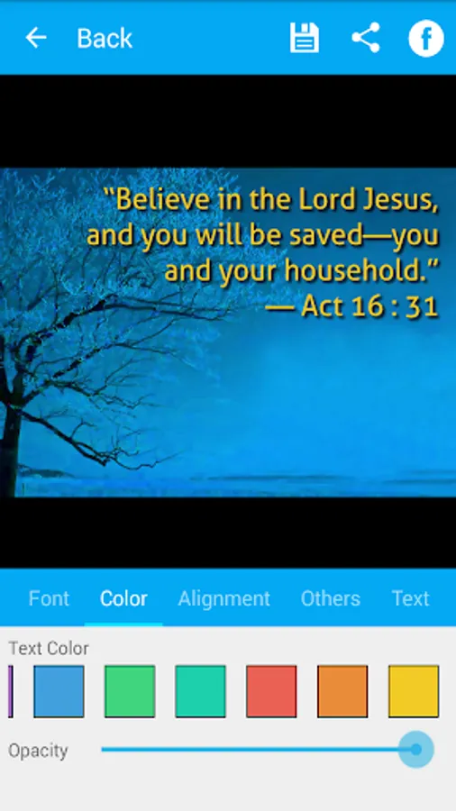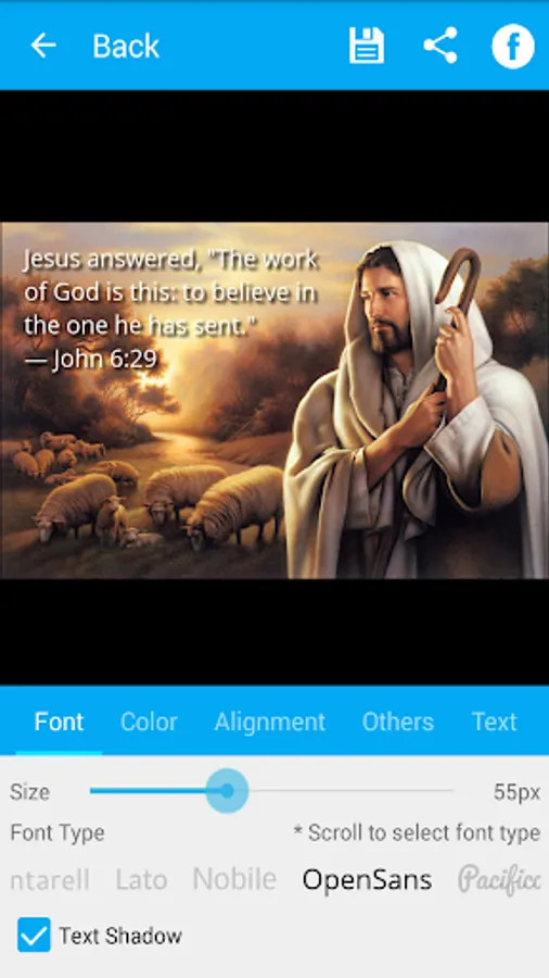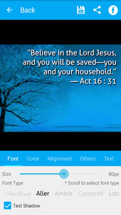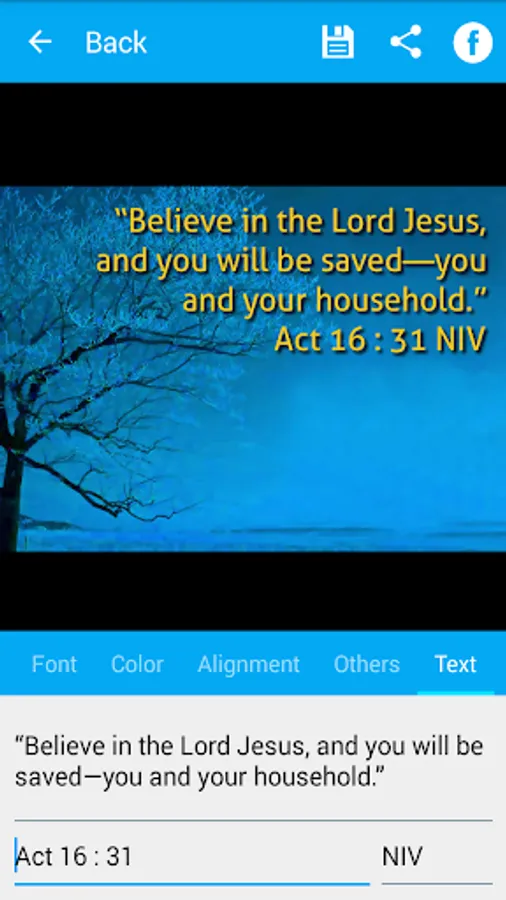 Bible Verse Art is an application to create beautiful Bible verse with customizable background image from predefined background image, your image collection (gallery) or directly from camera.
