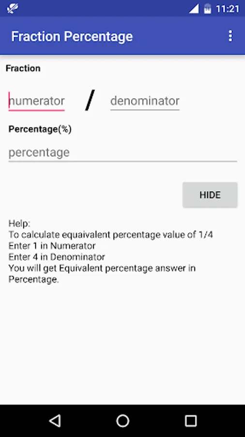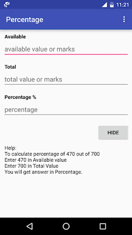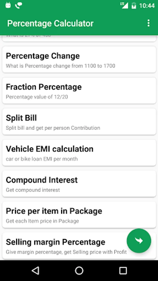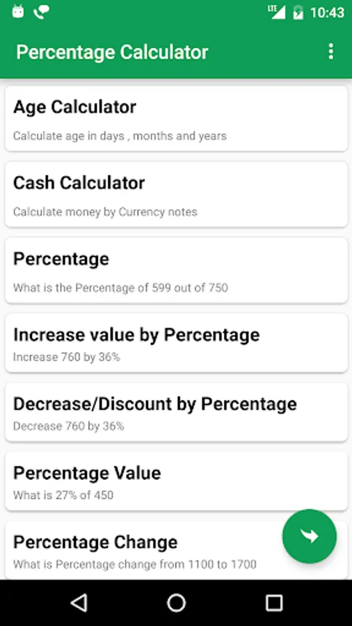 It is a perfect app to calculate percentage in a two steps. Calculate increase percentage decrease percentage, EMI calculations, Currency Calculations, Age calculator also there.