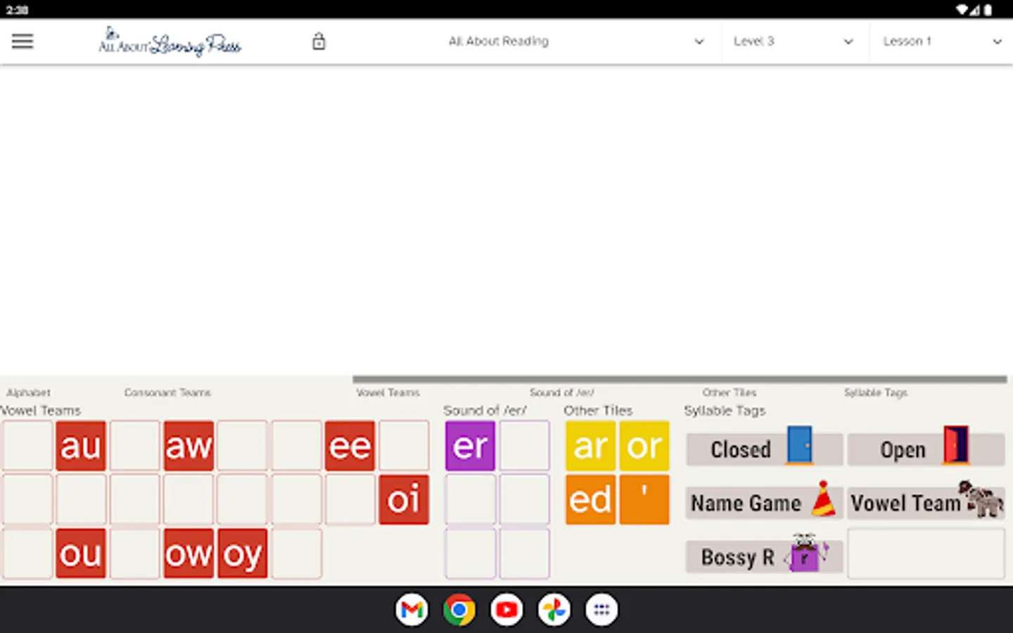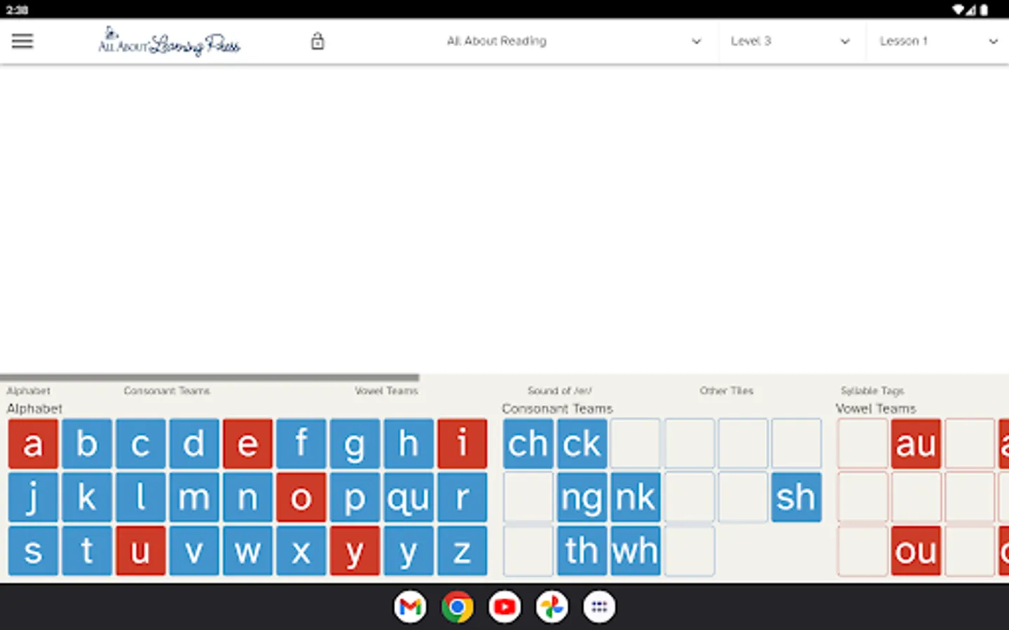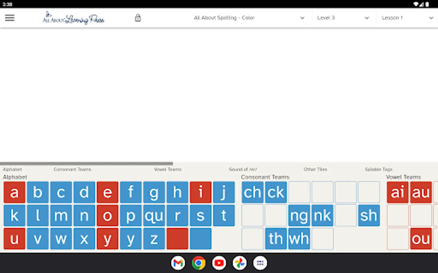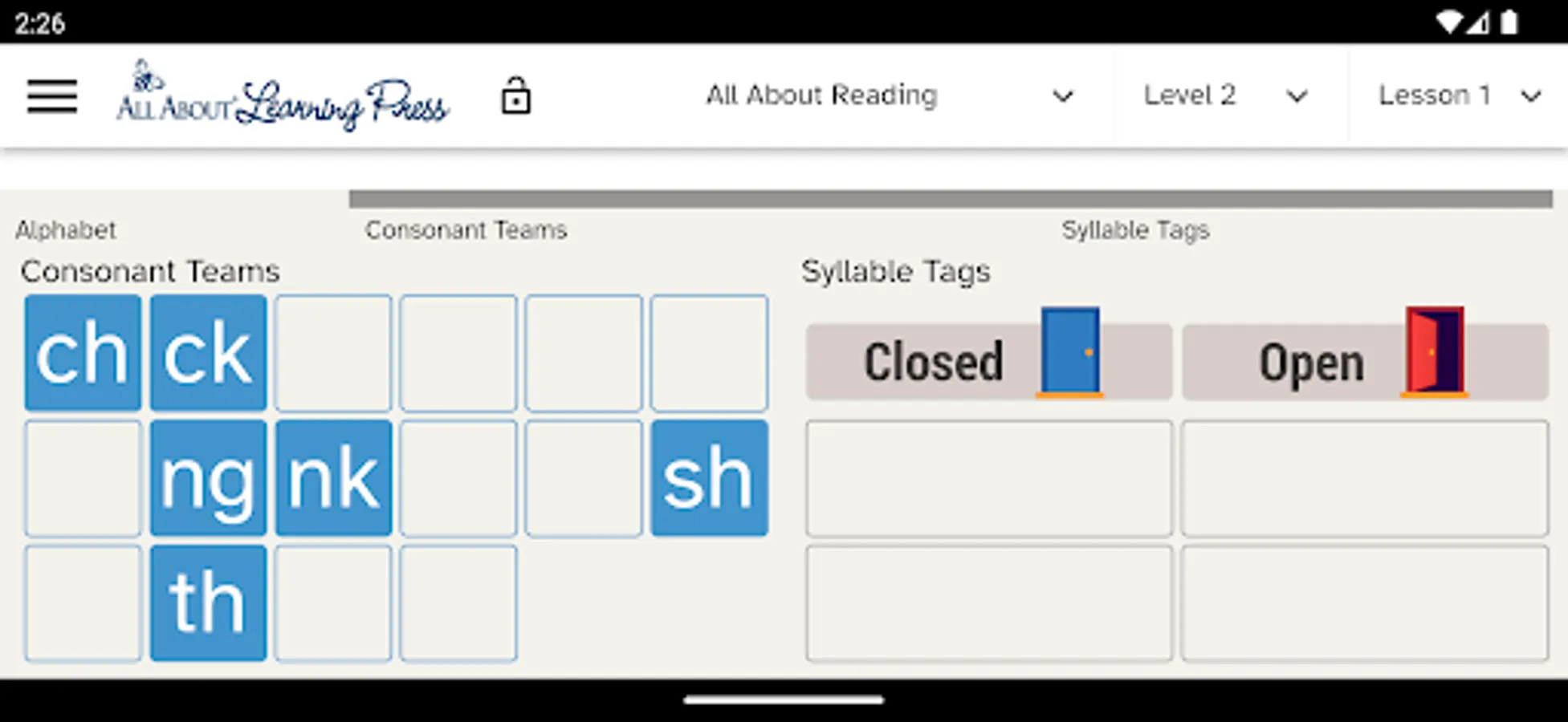 Our Letter Tiles app lets you build words, divide words into syllables, and hear the sounds of the phonograms. Just choose your program from the menu (All About Reading or All About Spelling) and select which lesson number you are currently teaching. The appropriate letter tiles for that lesson will appear, making it easy for you to teach and easy for your student to learn.