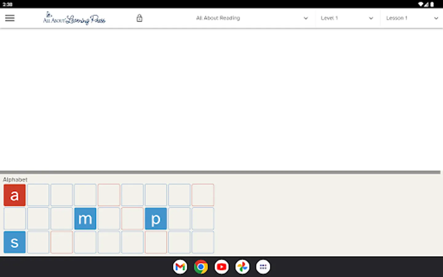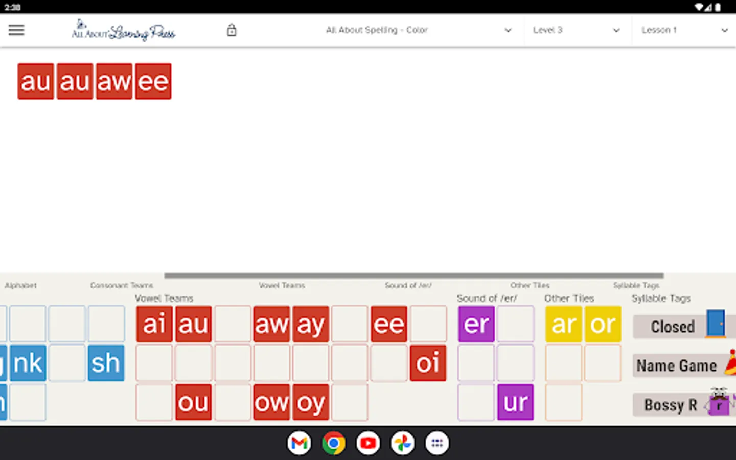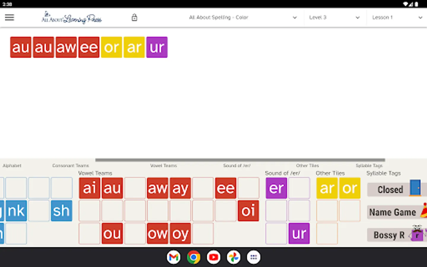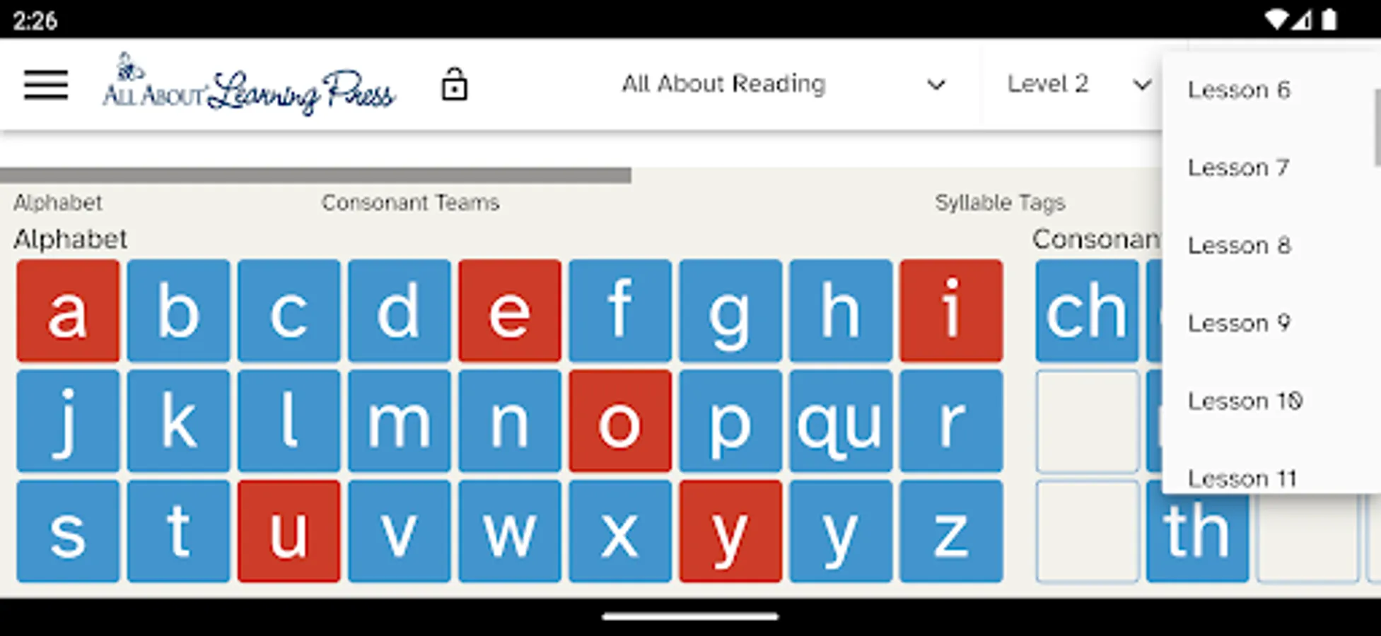 Our Letter Tiles app lets you build words, divide words into syllables, and hear the sounds of the phonograms. Just choose your program from the menu (All About Reading or All About Spelling) and select which lesson number you are currently teaching. The appropriate letter tiles for that lesson will appear, making it easy for you to teach and easy for your student to learn.