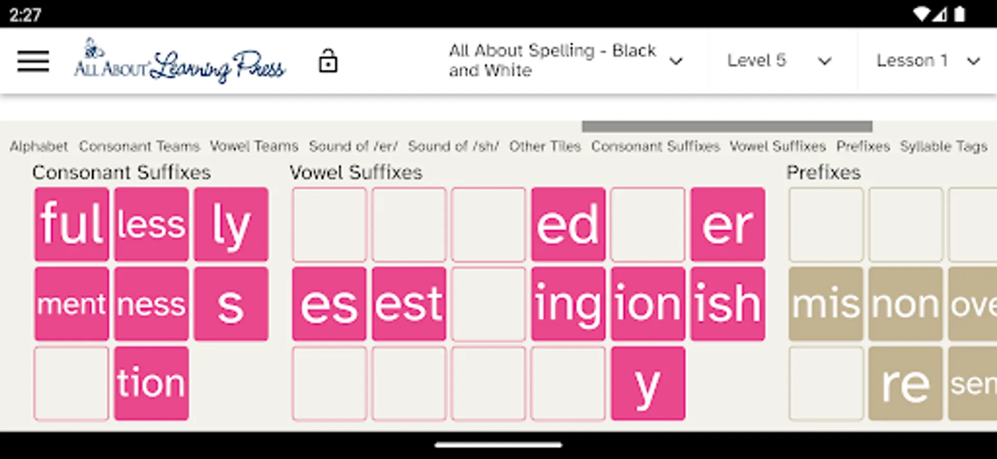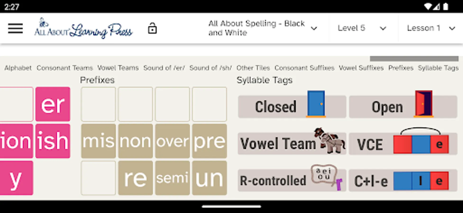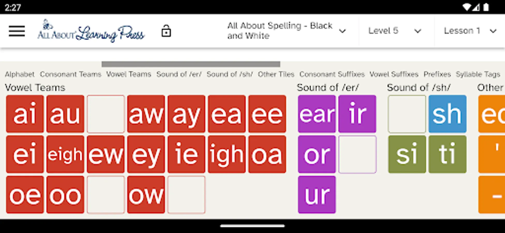 The app contains all the phonograms, suffixes, and word parts taught in the All About Reading and All About Spelling lesson plans.